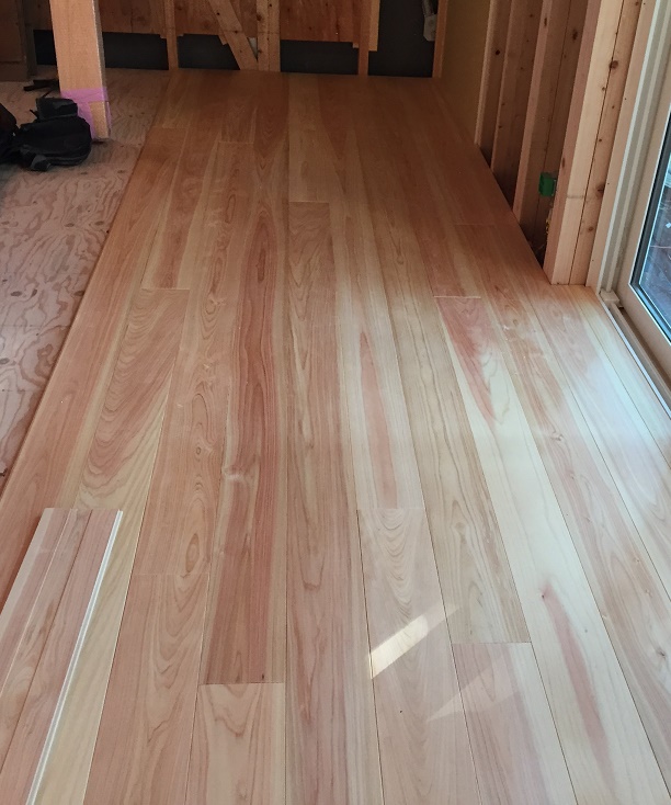 現在、『TOKYO WOOD』のヒノキ無垢フローリングを施工している現場の写真です。