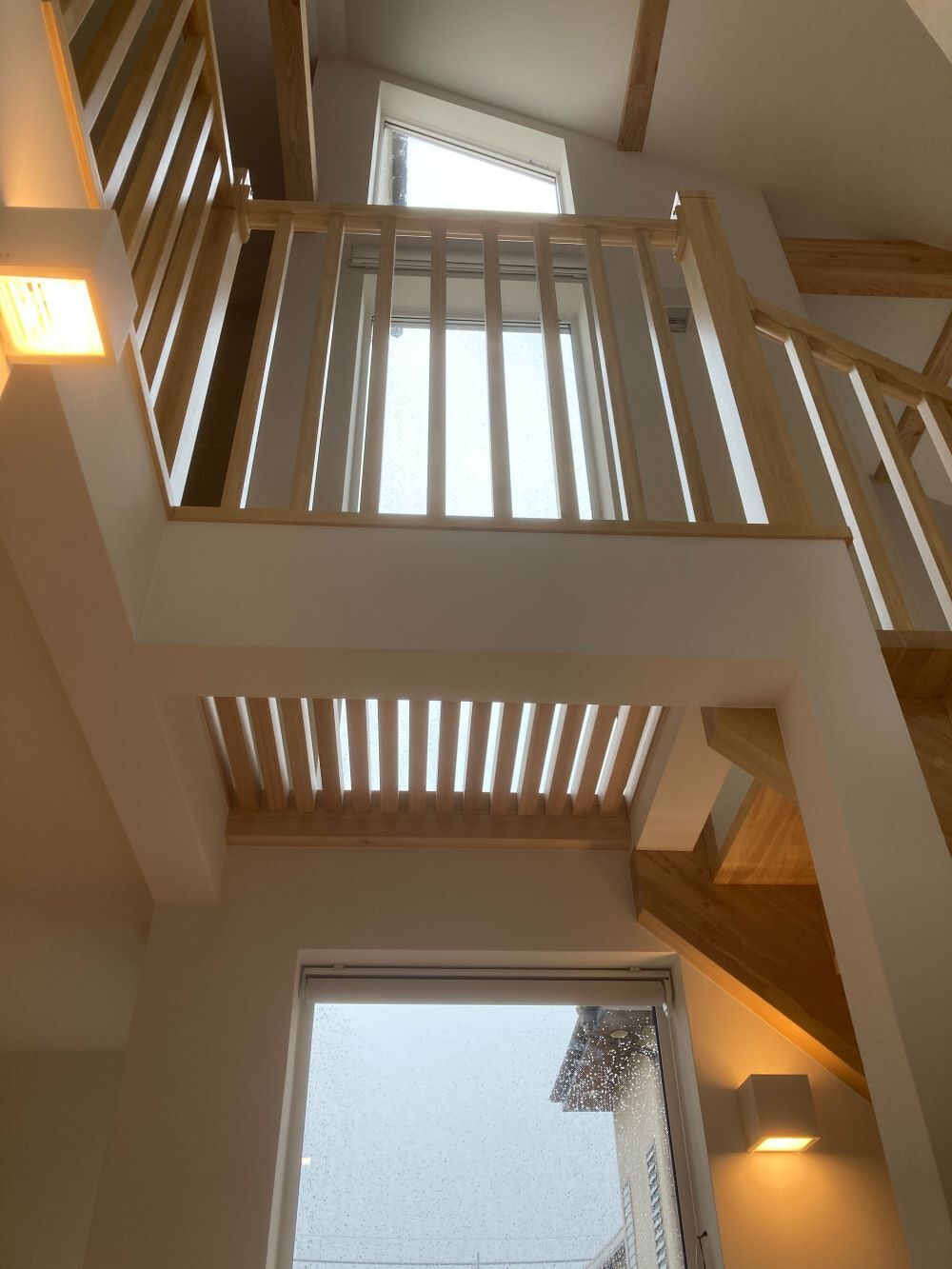 また、お施主様ご家族のご要望で1階階段を上がった正面に縦に長い大きな窓を配置。
