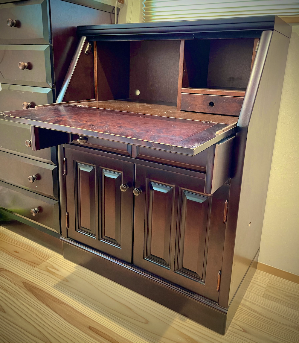 キャビネットの扉を開けると机になるという実用的でありつつ、工芸的なデザインをしていて、私のお気に入りです。