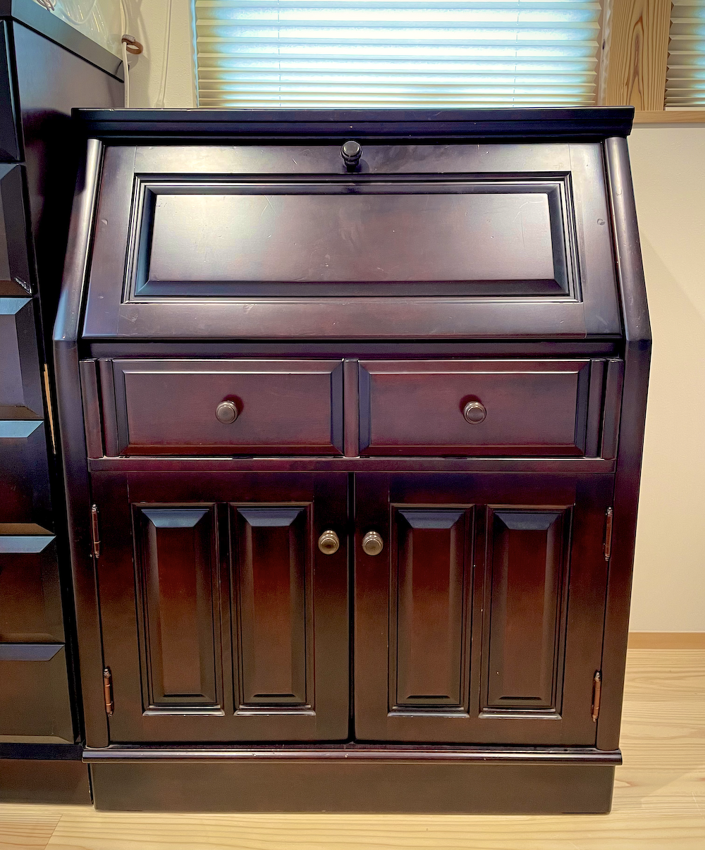日本には有名な民芸家具のブランドがいくつかあるのですが、このライティングデスクは北海道民芸家具という家具屋さんのもので、母の代から使い続けて40年くらい経ちます。