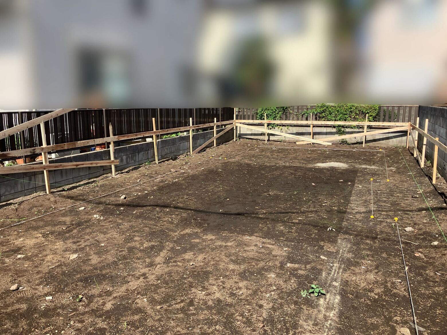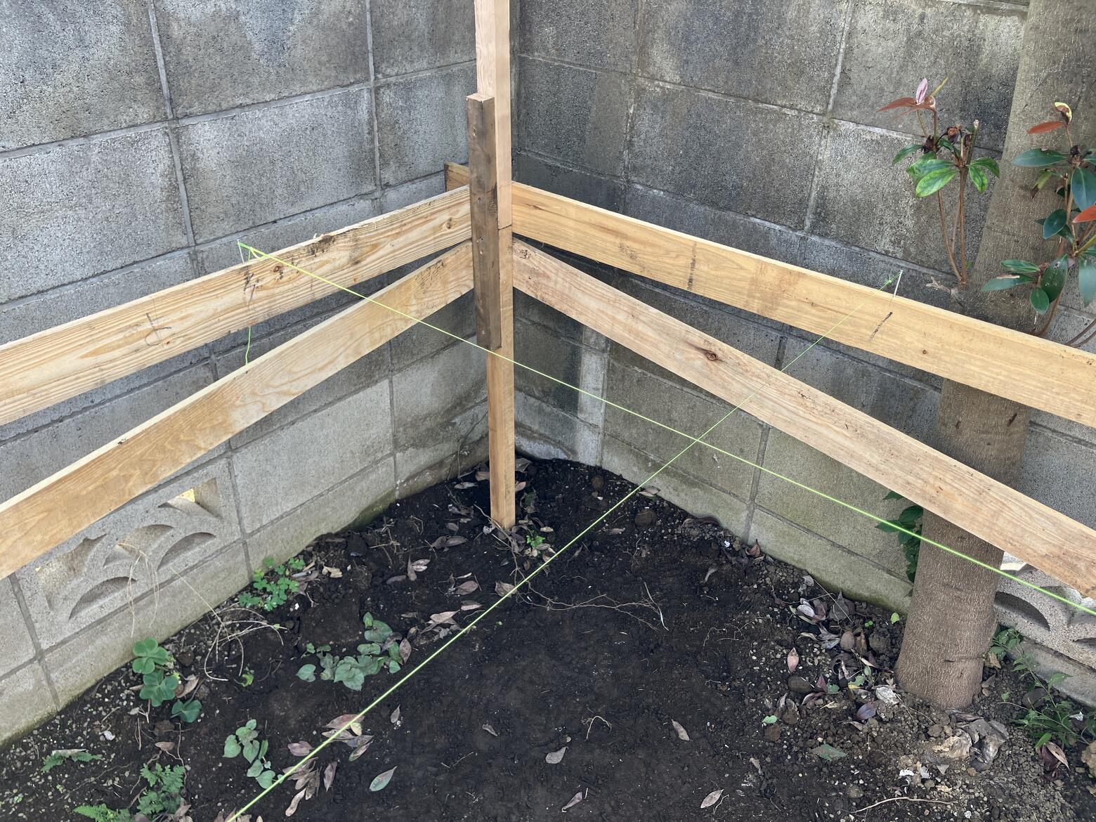 その杭を繋ぐように同じ高さで板を張り付けて囲いにします。