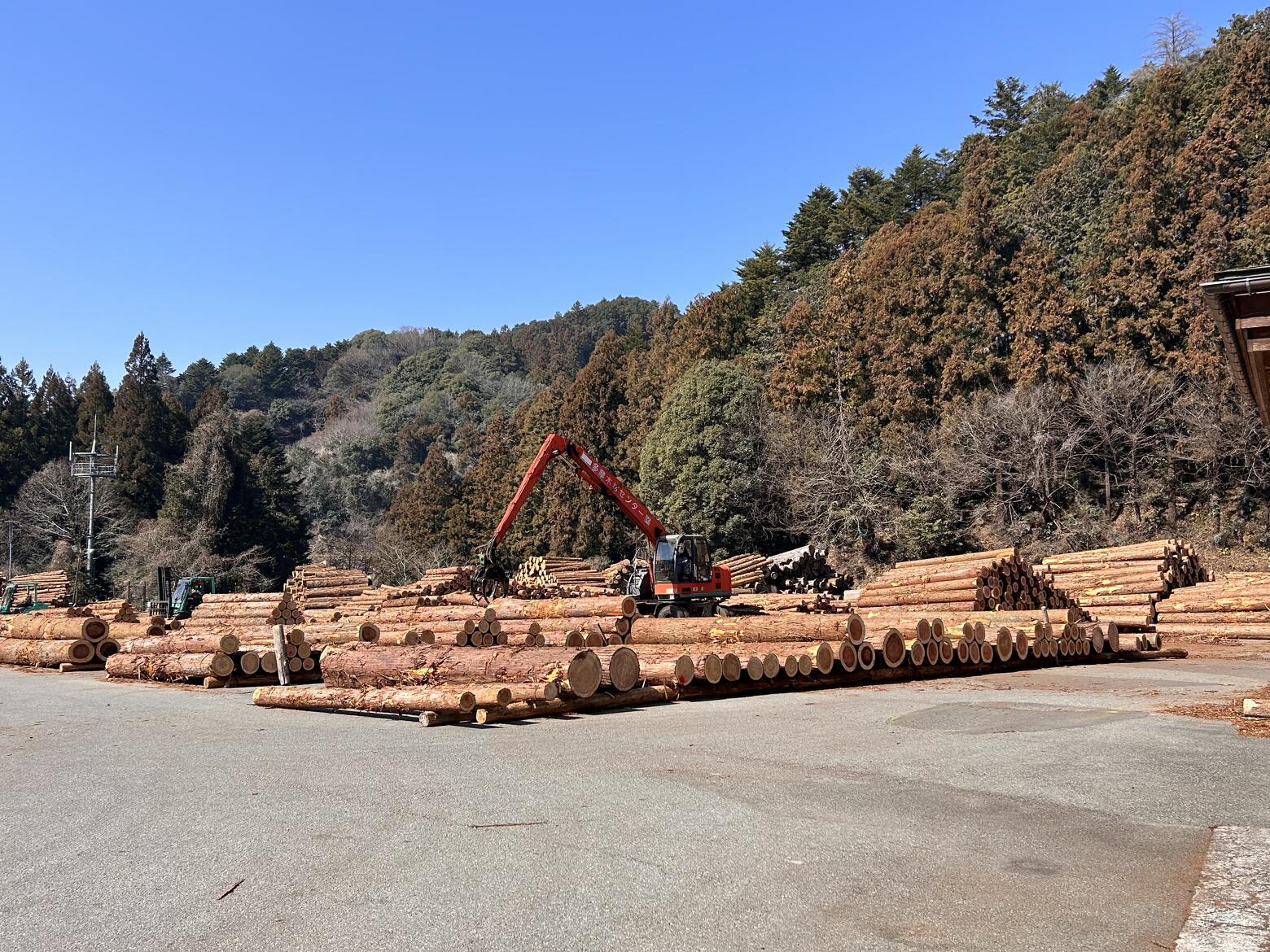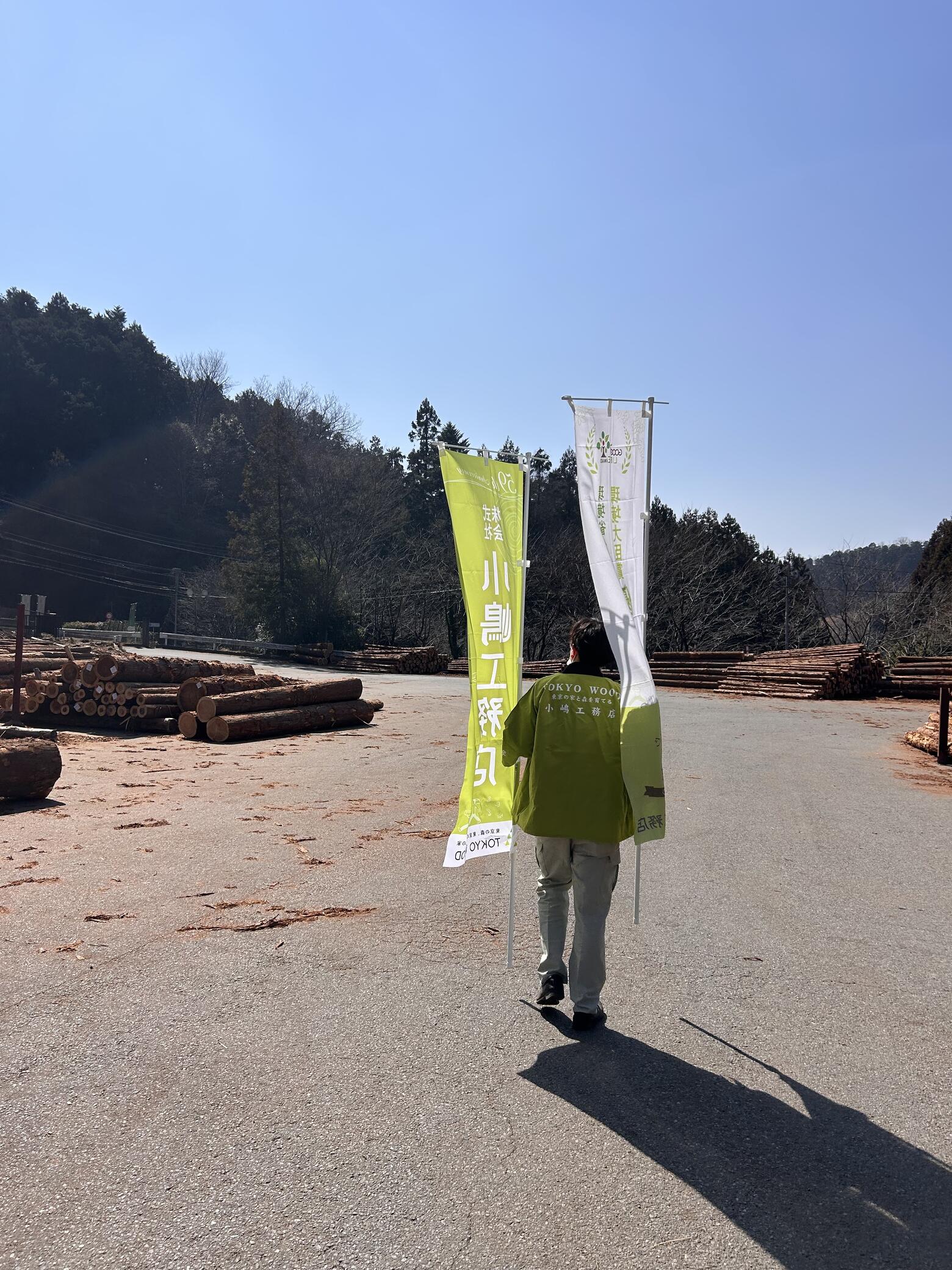 まずは原木市場にて、昼食のお弁当、席への名札、丸太の前での説明用に椅子の準備をします。