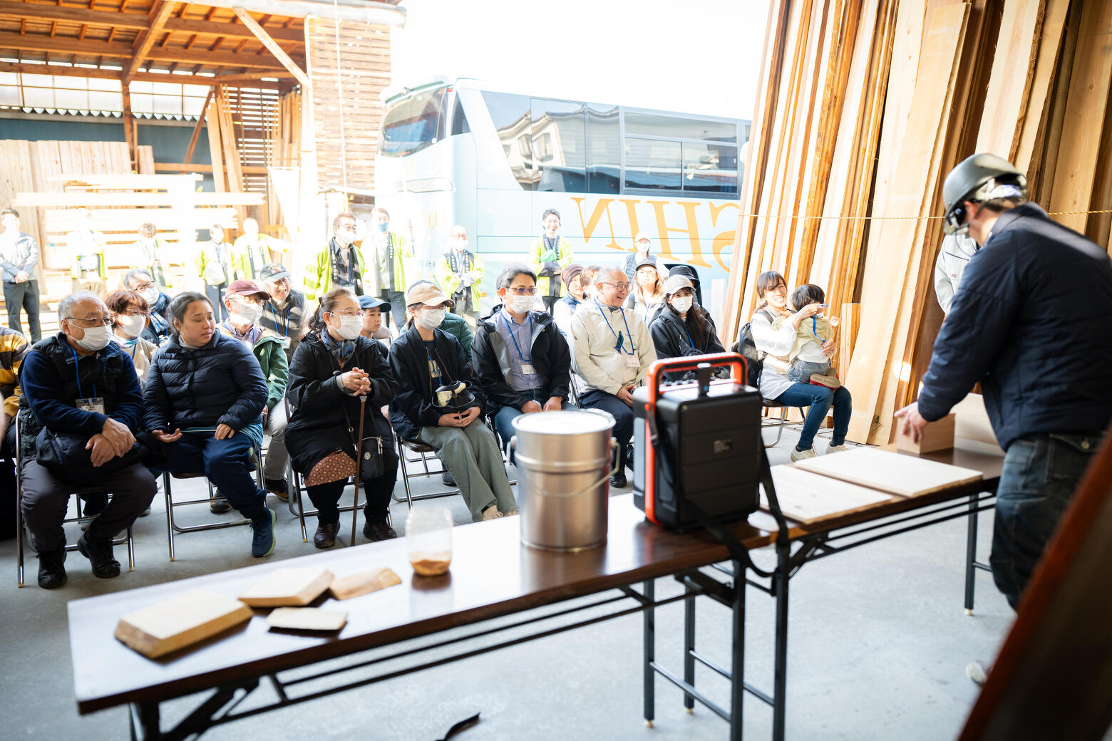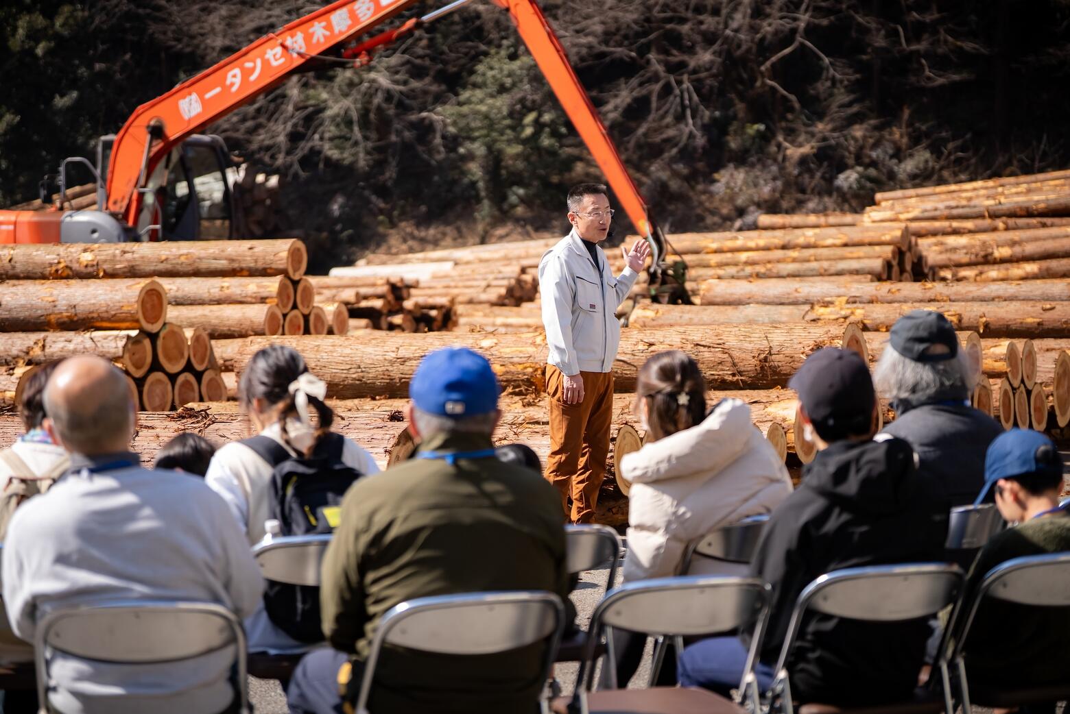 現在は花粉のピークを迎える時期。花粉症の方にとっては、杉や檜と聞くだけで「伐採してしまえばいいのに」と思われることもあるかもしれません。しかし、実際に花粉を多く放出するのは樹齢30年頃の木とされており、すべての杉や檜が花粉を発生させるわけではありません。そのため、花粉の少ない森林を育てるには、適切な伐採と木材の活用、新たな植林による森林循環が重要であることを教えていただきました。森林管理は単に木を伐ることではなく、未来の森を育てる営みでもあることを、職人の皆さんの言葉から改めて感じる機会となりました。