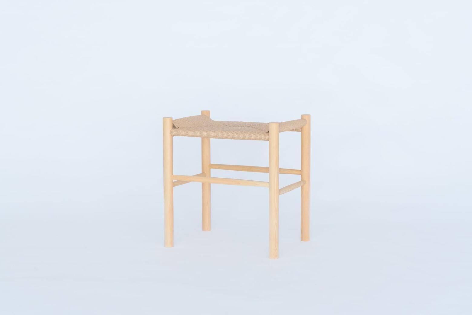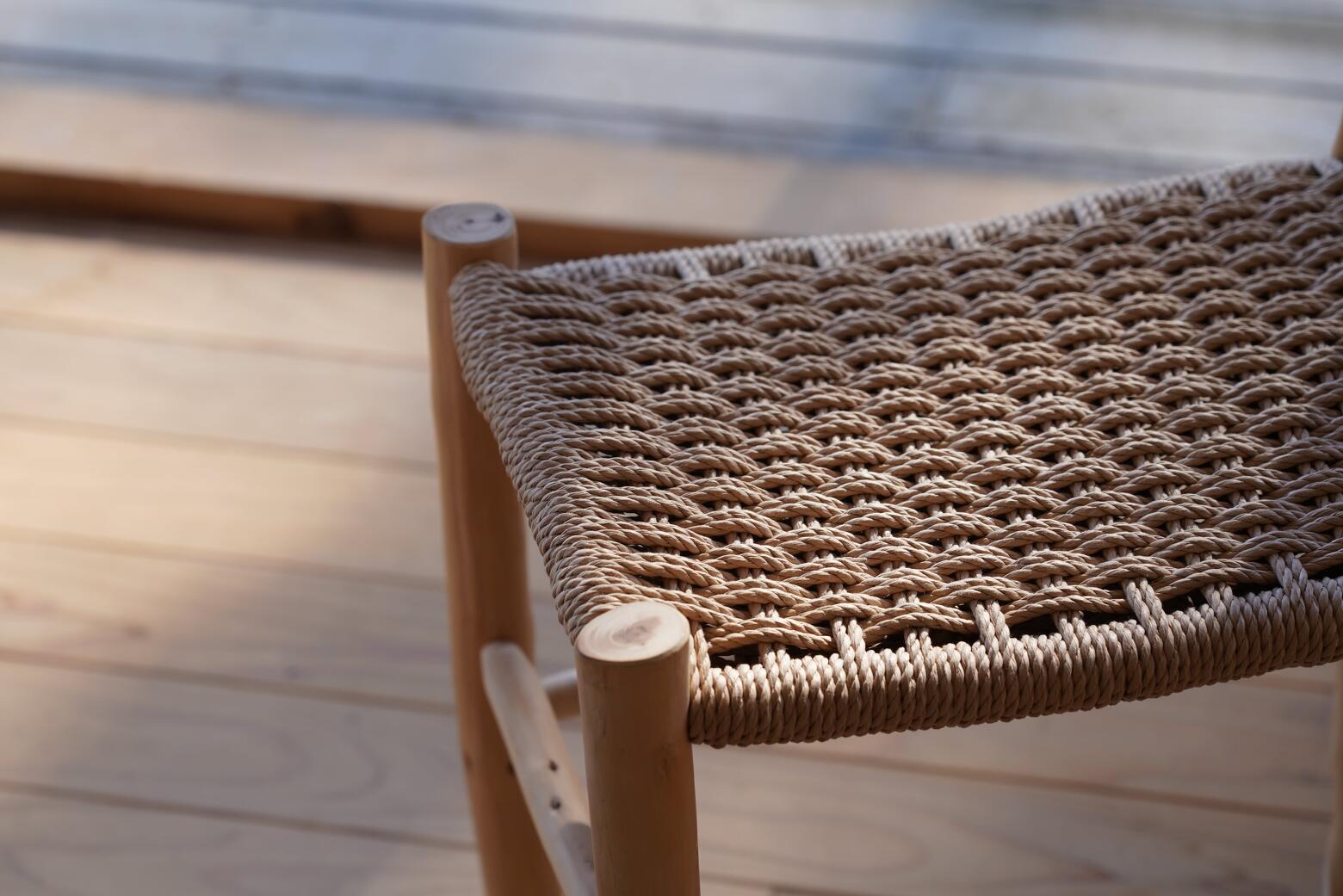 綺麗に整えられた形状はスタイリッシュで、リビングやダイニングなどの空間にぴったりです。ヒノキの材料を中心に使用し、白みのある綺麗な色合いが特徴です。座面は封筒編みを行なっているため、中心に向かって少し沈み、やわらかくゆったりとした座り心地になっています。