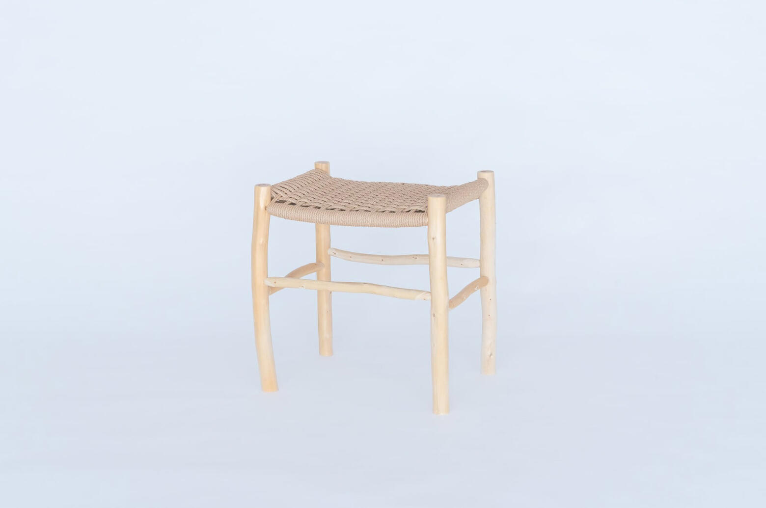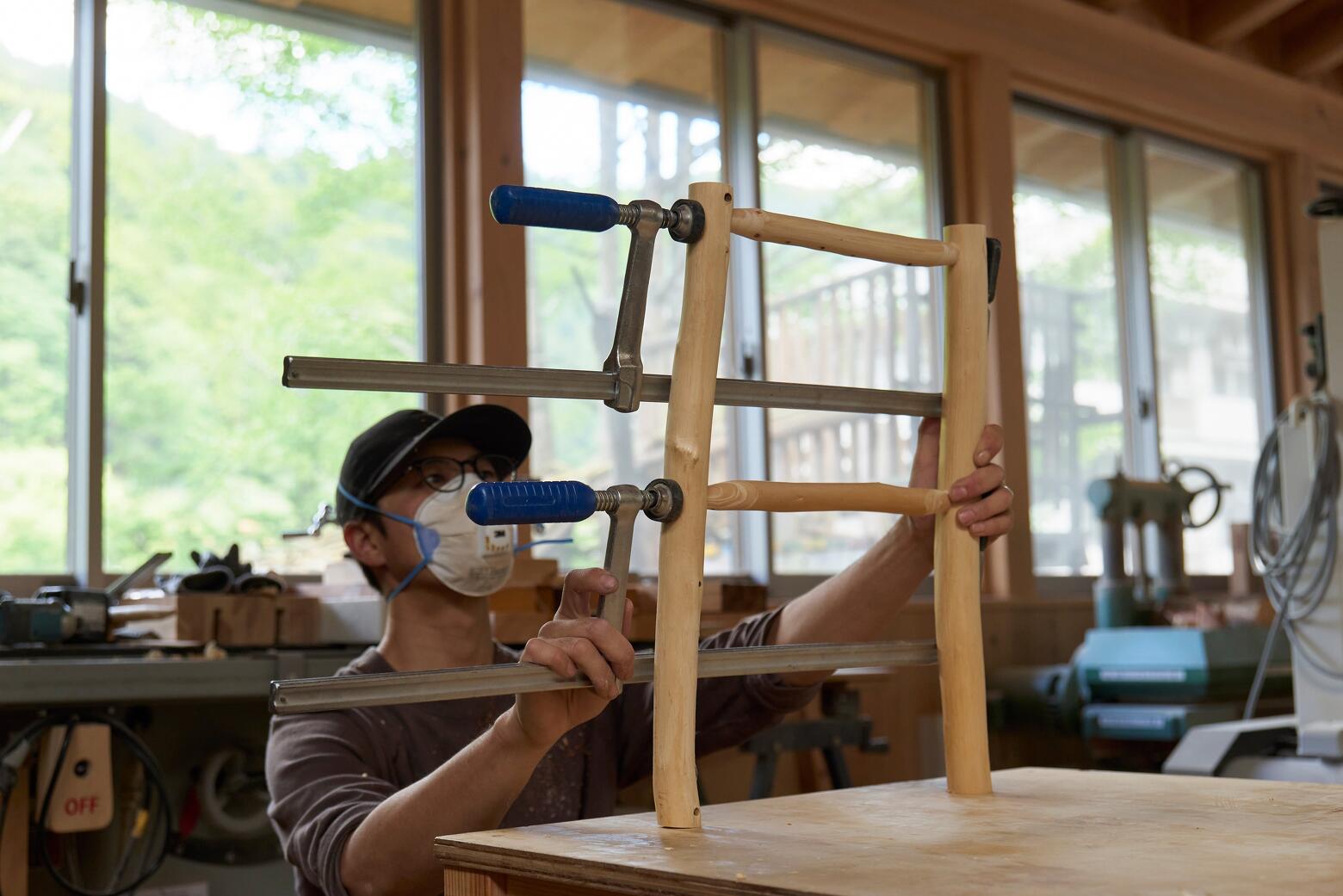 職人が形の異なる枝を1本ずつ選び、丁寧に組み上げて制作しています。座面は平編みを行なっているため、しっかりとした座り心地が特徴です。素材に使用している枝は、山の中で光を求めてその腕を伸ばし、まっすぐに育つことはありません。1本1本の枝からも、さらに側枝が生え、それらが節となり、支える根本には筋肉質な表情を見ることができます。