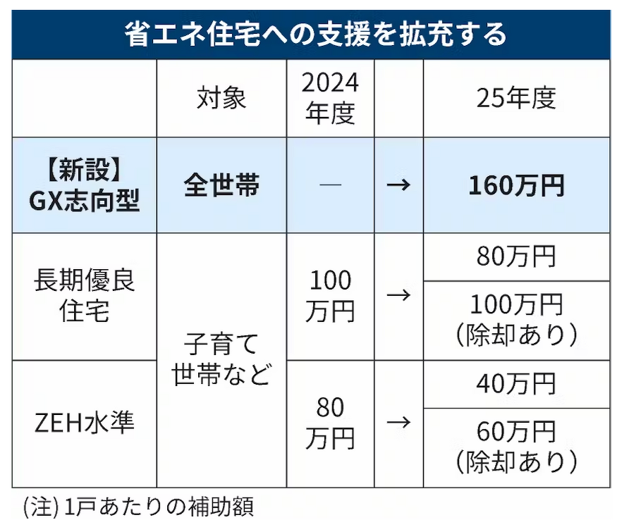 補助の対象にする。24年度まではエネルギー消費を⼤きく減らす「ZEH(ゼロ・エ ネルギー・ハウス)⽔準」の住宅を補助の対象にしていた。