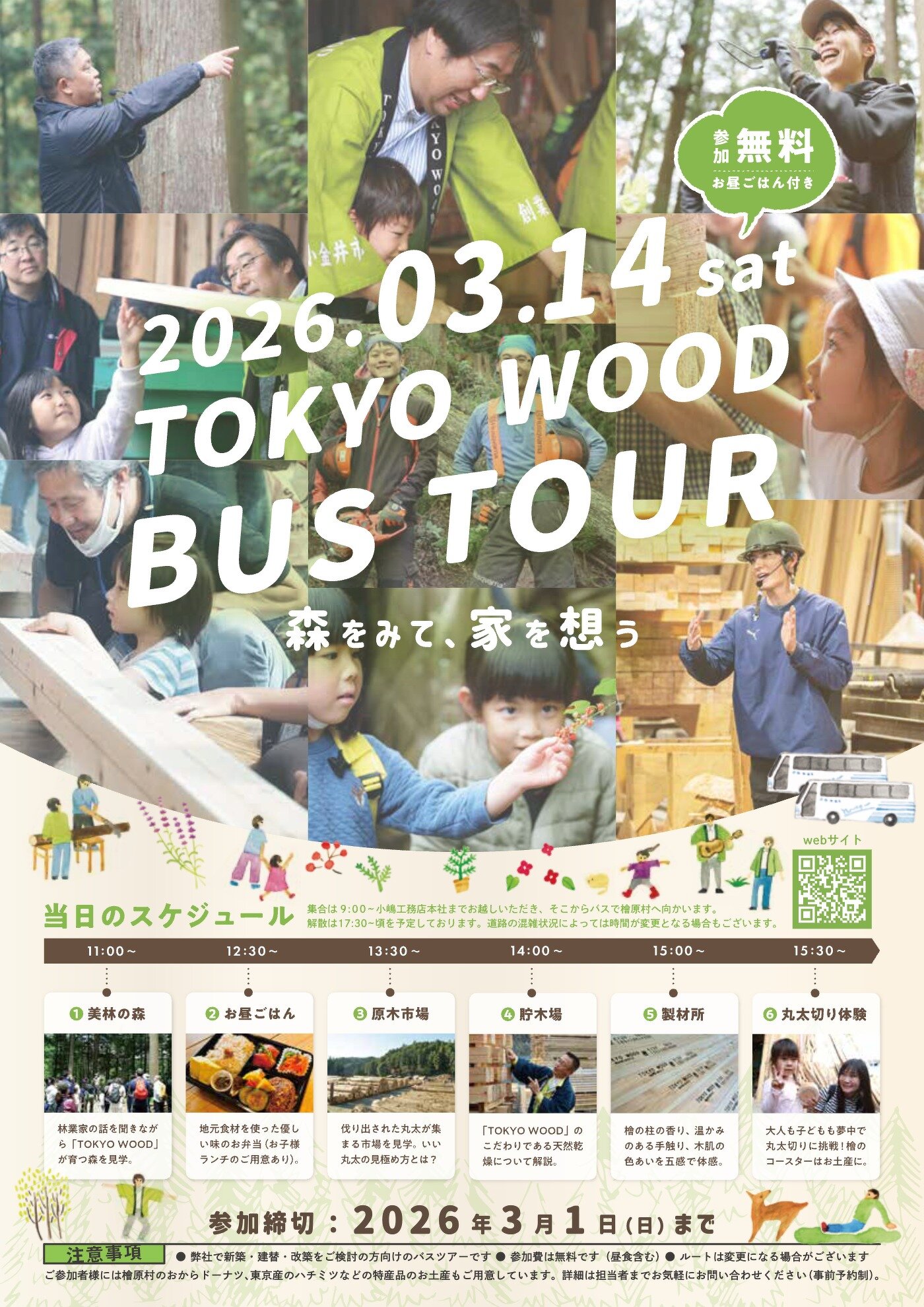 3月14日(土)、春のTOKYO WOODバスツアーを開催いたします。日帰りバスツアーでは、東京の美しい森を巡りながら、新築や改装をお考えのお客様に、“新しいお住まい”に使われる木がどこで育ち、どのようにして私たちのもとに届くのかを丸っと1日で巡ります。