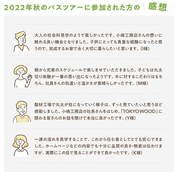 毎回大人気の東京の森をめぐる日帰りバスツアー。新築・改装をご検討中のお客様の“新たな家”に使われる木はどこで育ち、どこからやって来るのかを見に行くツアーです。林業家によって丁寧に育てられ、原木市場で質の良い丸太を選別し、製材所で柱やフローリングに加工されていく過程を、まるっと体験することができます。地産地消のTOKYO WOODの素材生産業に携わる方々から直接お話が聞け、実際の木を身近に見ることが出来る貴重な一日です。