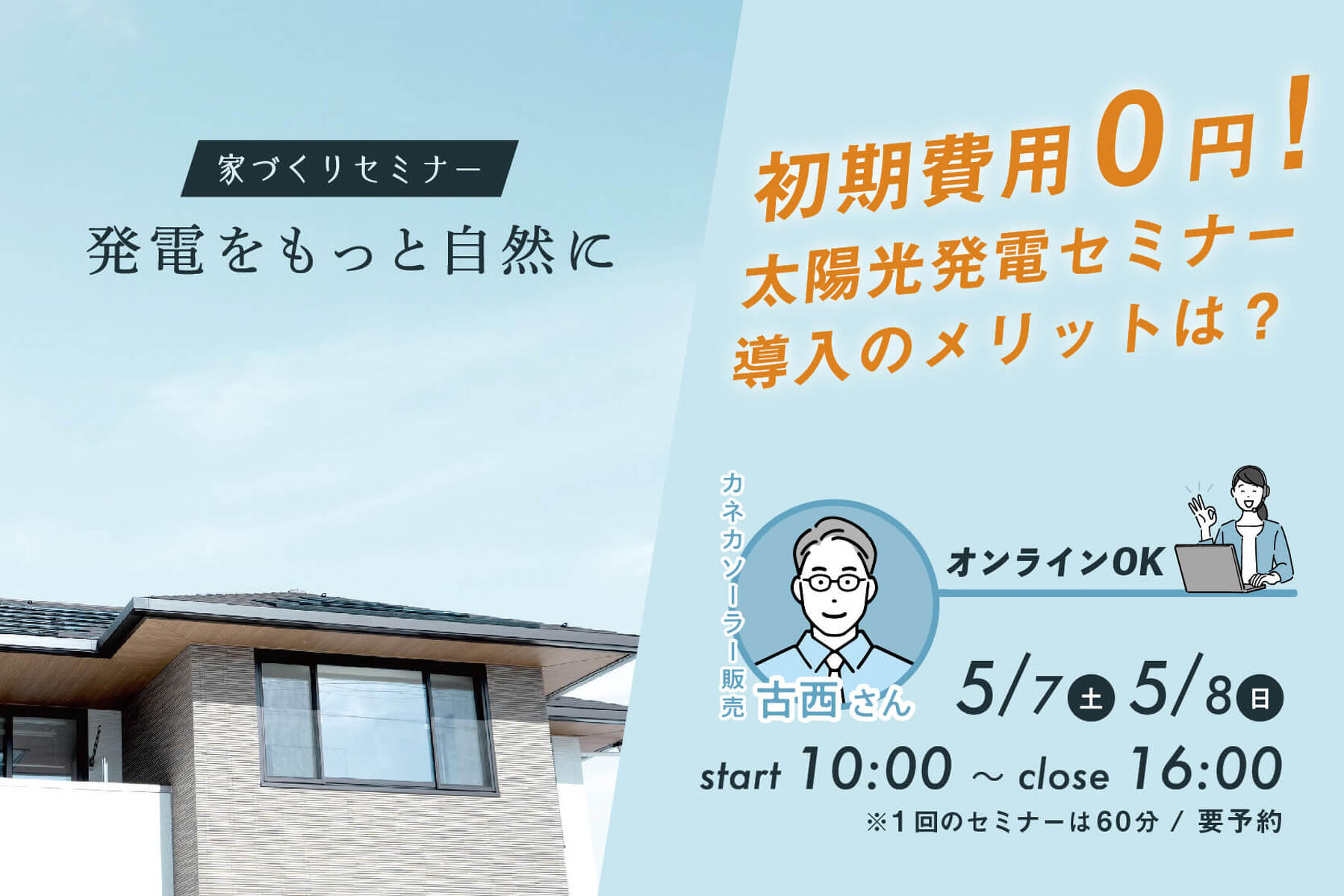 お話いただくのは「カネカソーラー販売」開発会社の担当古西さん。〝太陽の光″を〝電気″に変える太陽光発電。基本の仕組みはもちろん、発電からご利用まで、設備を含めた太陽光発電システムのしくみをお話しさせていただきます。