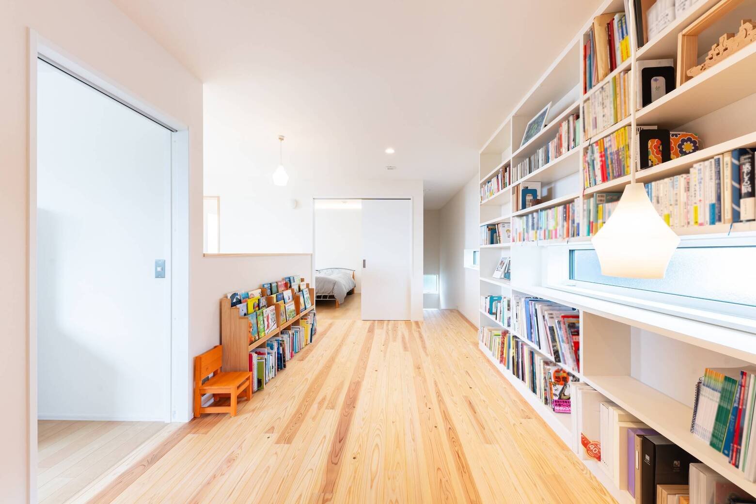 玄関ホールからLDKまでの床全面に、ご夫婦お気に入りの『TOKYO WOOD』の無垢桧材を採用。キッチンも無垢材の扉のものをセレクトし、家に入ったとたんに、さわやかな香りとぬくもりいっぱいに包まれる、癒しの空間に仕上がりました。また、リビングには大きな収納棚を造作。テレビやエアコンがすっぽりと収まり、玄関からは死角となるので、生活感が出ずスッキリとした空間を演出。テレビの下には家族一人にひとつずつ、収納スペースを作り、このように場所を決めておくと、自然と自分で片付ける習慣が身につくのでおススメです。また“庭”のある暮らしを満喫できるように、リビングには濡れ縁、洗面脱衣室には勝手口、さらに玄関からぐるりと回遊できる動線を設けるなどで、気軽に自然と触れ合えるように工夫されています。