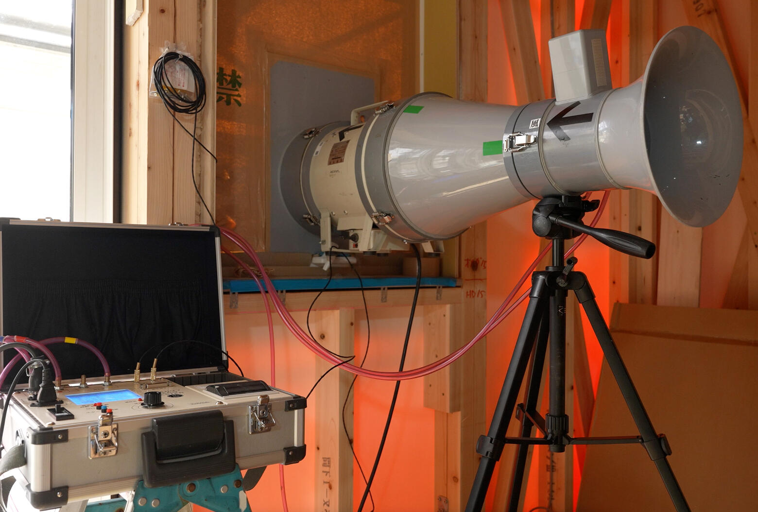 一棟一棟すべてのお住まいで気密測定を実施し、平均C値0.5という高い水準を実現しています。その測定の様子を公開し、確かな施工品質をご覧いただけるようにしています。