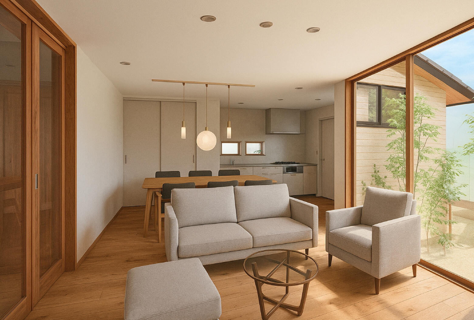 今回ご見学いただくのは、ご夫婦と3人のお子さまが暮らす予定のお住まい。奥さまのお父さまの家を建て替えるタイミングに合わせ、同じ敷地内の更地に新たな家を建てる計画が始まりました。二世帯住宅ではありませんが、庭を共有しながらお互いの暮らしを尊重できる距離感を大切に。「行き来しやすいけれど、ちゃんとプライベートもある」そんな心地よい関係をかたちにした住まいです。