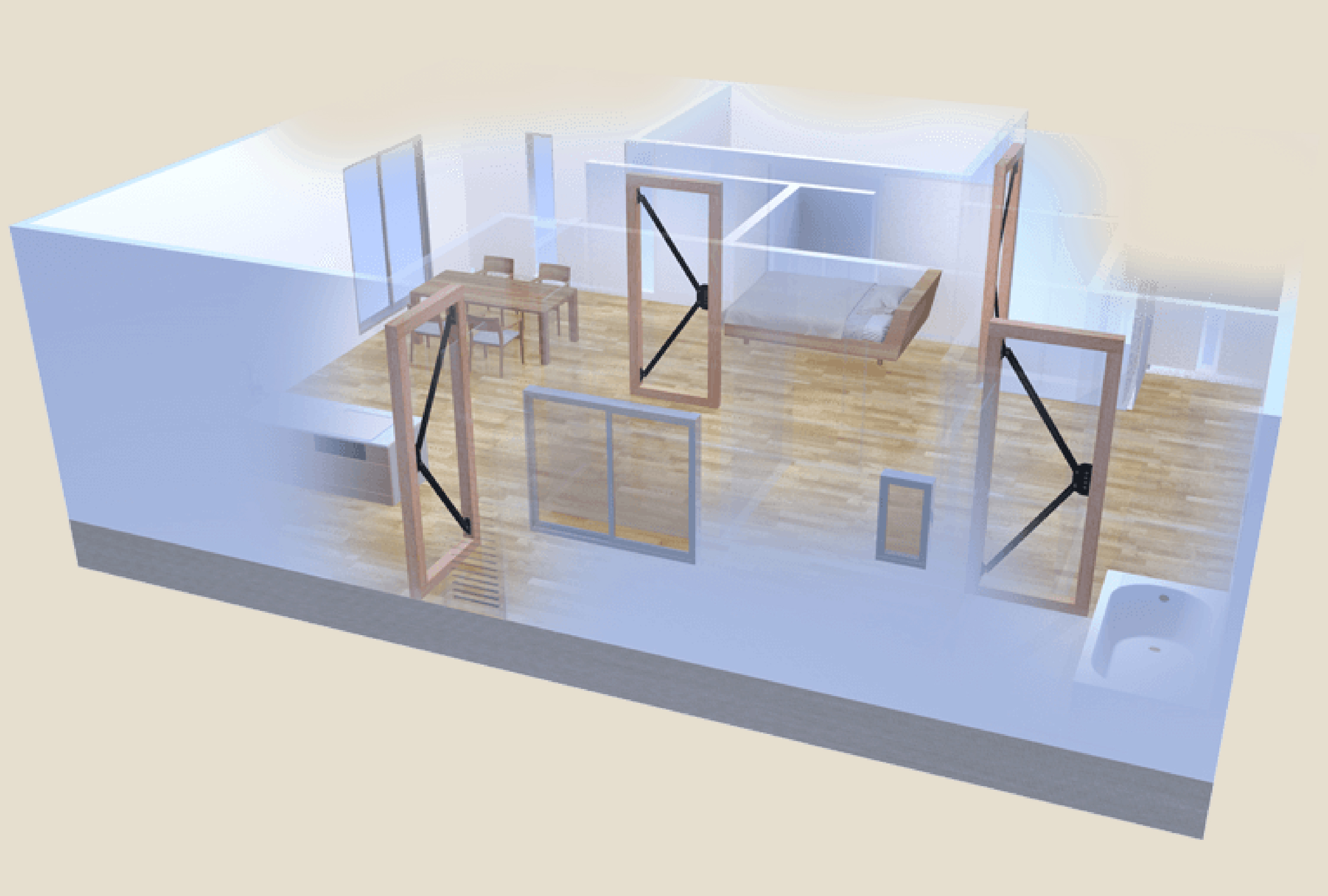 Kダンパー(制振ダンパー)を取り入れることで、地震時の揺れが抑えられ、建物への負担を軽減することにつながります。柱や梁へのダメージが小さくなることで、地震後も歪みや不具合が生じにくく、長く住み続けやすい住まいの状態を保ちやすくなります。