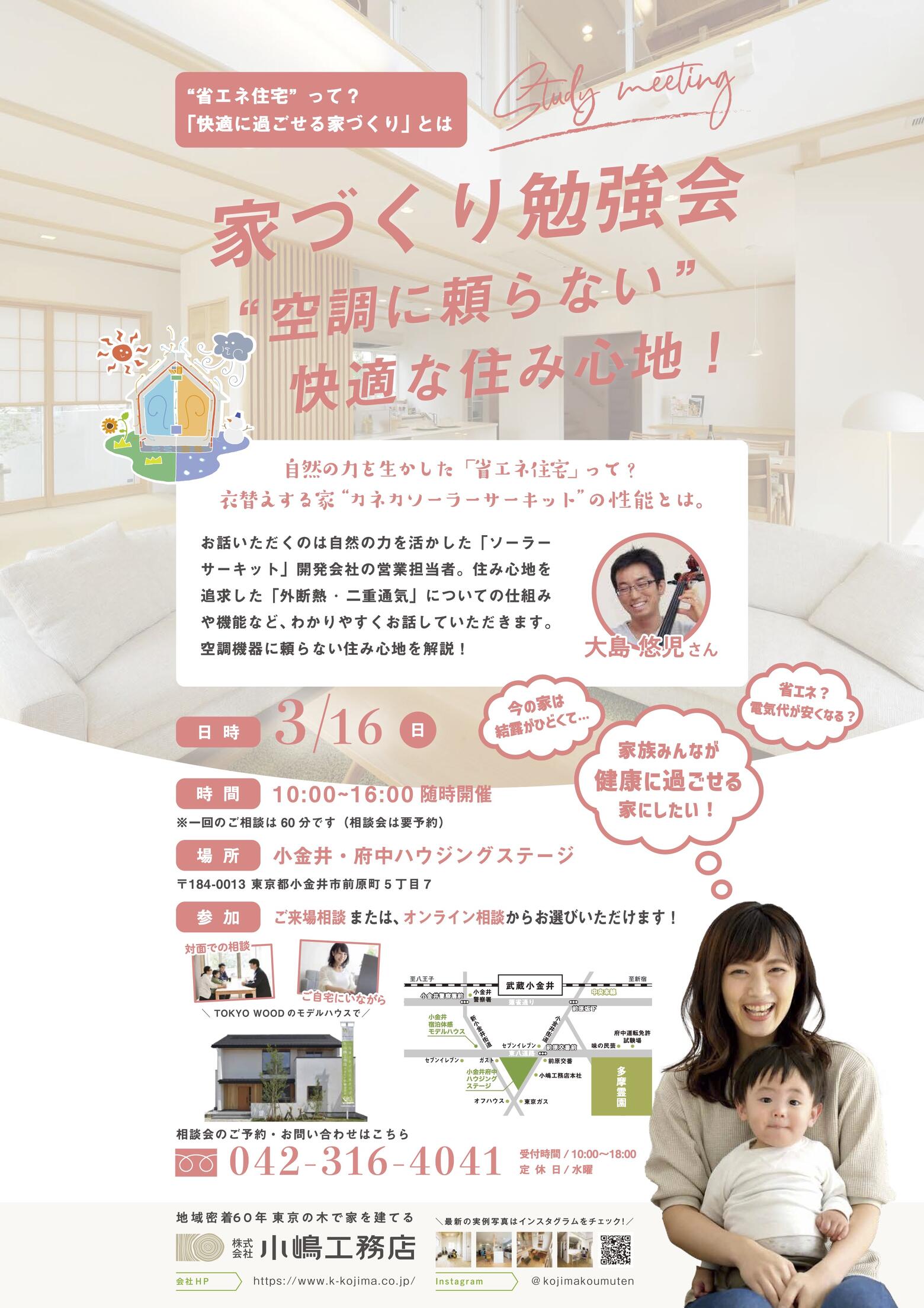 新しいお住まいを考える上で、エアコンの設置台数によって電気代は大きく変動します。講師を務める大島様は実際に小嶋工務店でお家を建てられ、ソーラーサーキットの家で暑い夏も、寒い冬も快適に過ごされています。実際のオーナー様としての立場でもあり、気になる質問になんでもお答えいたします。