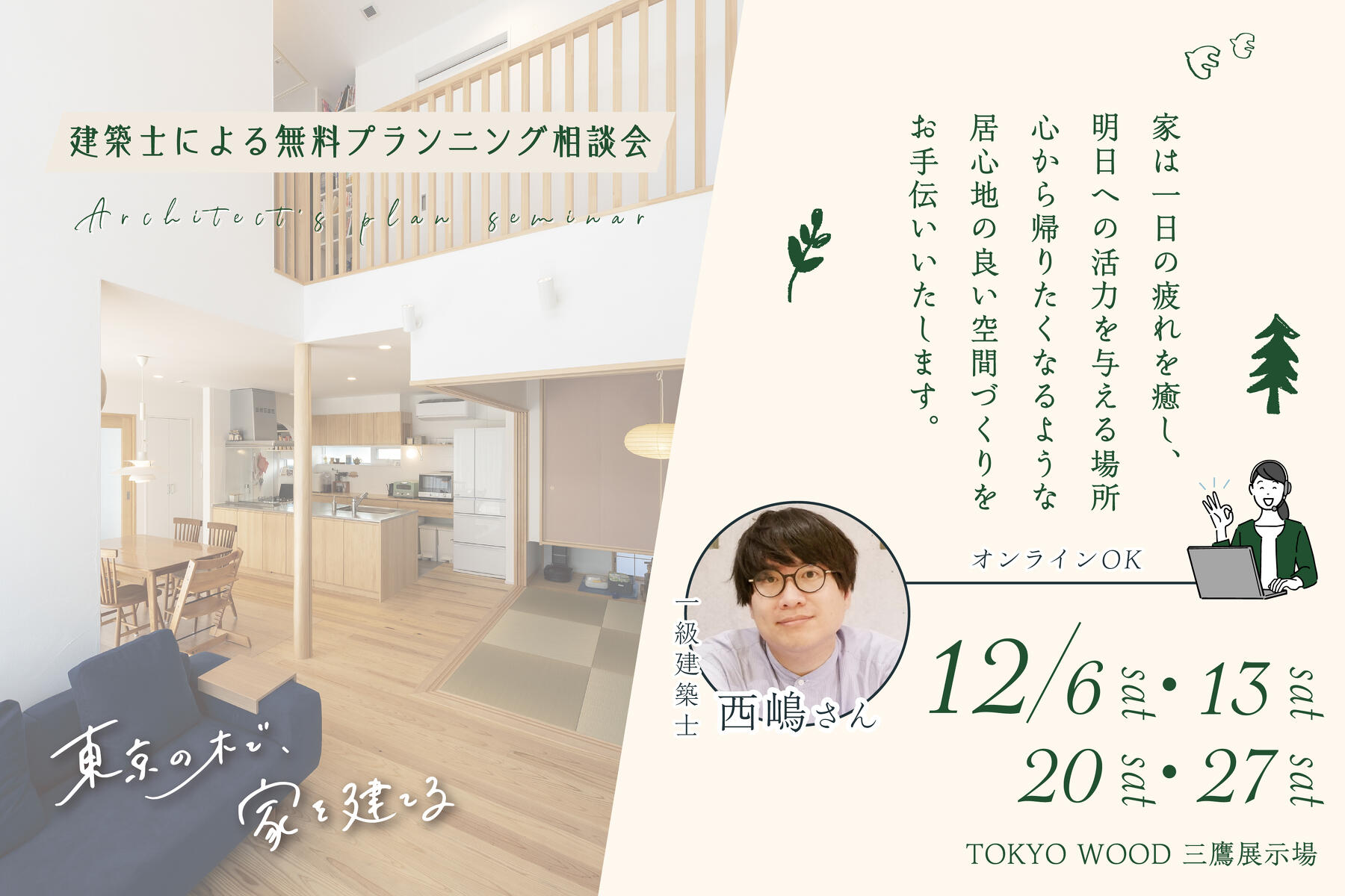 建築士が理想の間取りをご提案させていただく無料プランニング相談会を開催いたします。小嶋工務店では設計事務所とコラボレーションして、TOKYO WOODを使用した自然素材の家を、デザインの力でさらに魅力を引き出すことができる建築士と一緒に家づくりを行っています。「どんな暮らしがしたいですか?」というお客様の“らしさ”をヒアリングした上でプランニングいたします。ご予算などのご要望に合わせた幅広いご提案をいたします。一般的に設計事務所にプランニングを依頼した場合、費用が発生することもございますが、小嶋工務店では無料で受け付けております。プロのご提案を受けていただくことで、新しい暮らしのイメージを膨らませていただき、そして家づくりのワクワク感を楽しんでいただけましたら幸いです。ぜひお気軽にご参加ください。