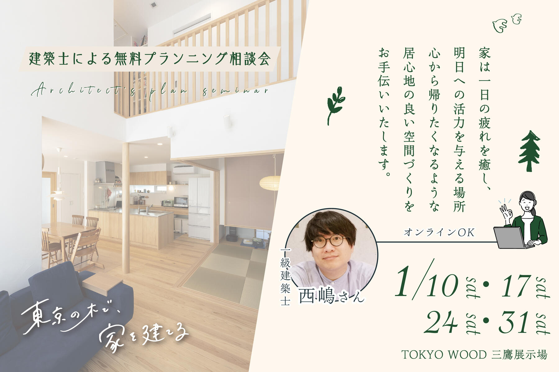 建築士が理想の間取りをご提案させていただく無料プランニング相談会を開催いたします。小嶋工務店では設計事務所とコラボレーションして、TOKYO WOODを使用した自然素材の家を、デザインの力でさらに魅力を引き出すことができる建築士と一緒に家づくりを行っています。「どんな暮らしがしたいですか?」というお客様の“らしさ”をヒアリングした上でプランニングいたします。ご予算などのご要望に合わせた幅広いご提案をいたします。一般的に設計事務所にプランニングを依頼した場合、費用が発生することもございますが、小嶋工務店では無料で受け付けております。プロのご提案を受けていただくことで、新しい暮らしのイメージを膨らませていただき、そして家づくりのワクワク感を楽しんでいただけましたら幸いです。ぜひお気軽にご参加ください。