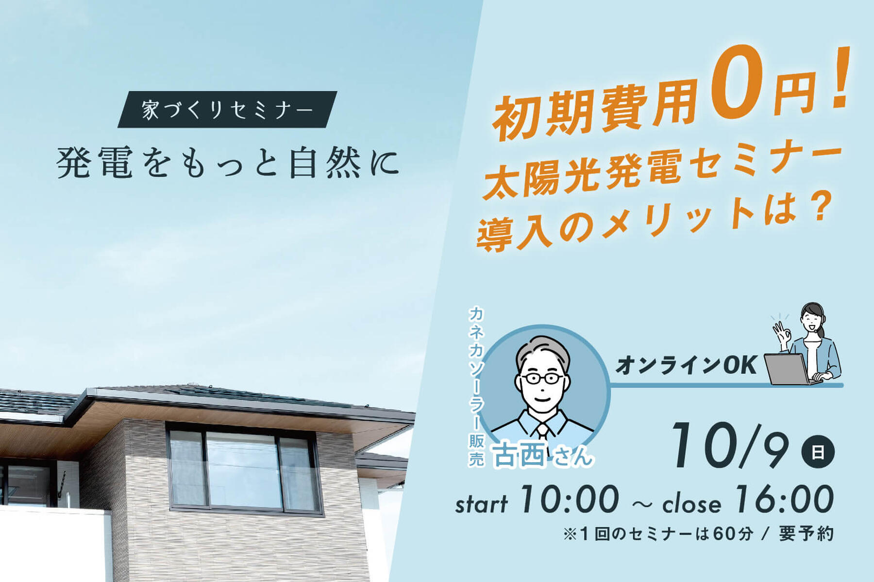 お話いただくのは「カネカソーラー販売」開発会社の担当古西さん。〝太陽の光″を〝電気″に変える太陽光発電。基本の仕組みはもちろん、発電からご利用まで、設備を含めた太陽光発電システムのしくみをお話しさせていただきます。
