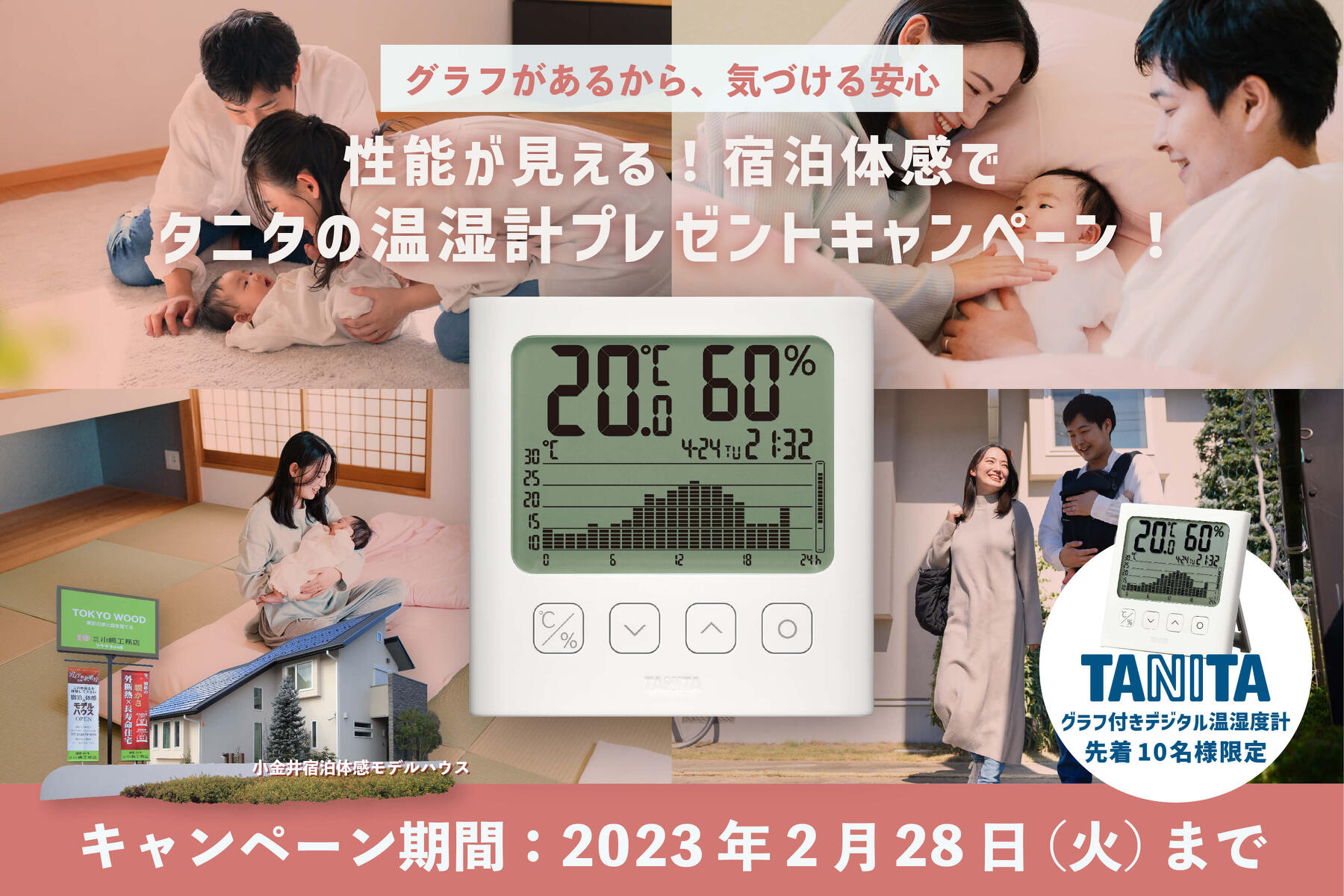 本キャンペーンでは、宿泊体感モデルハウスにご宿泊されるお客様へタニタ グラフ付きデジタル温湿度計を先着10名様にプレゼントします!現在お住まいの室内環境(温度)の違いを温室計で計測することで、断熱気密の違いをご体感いただけます!