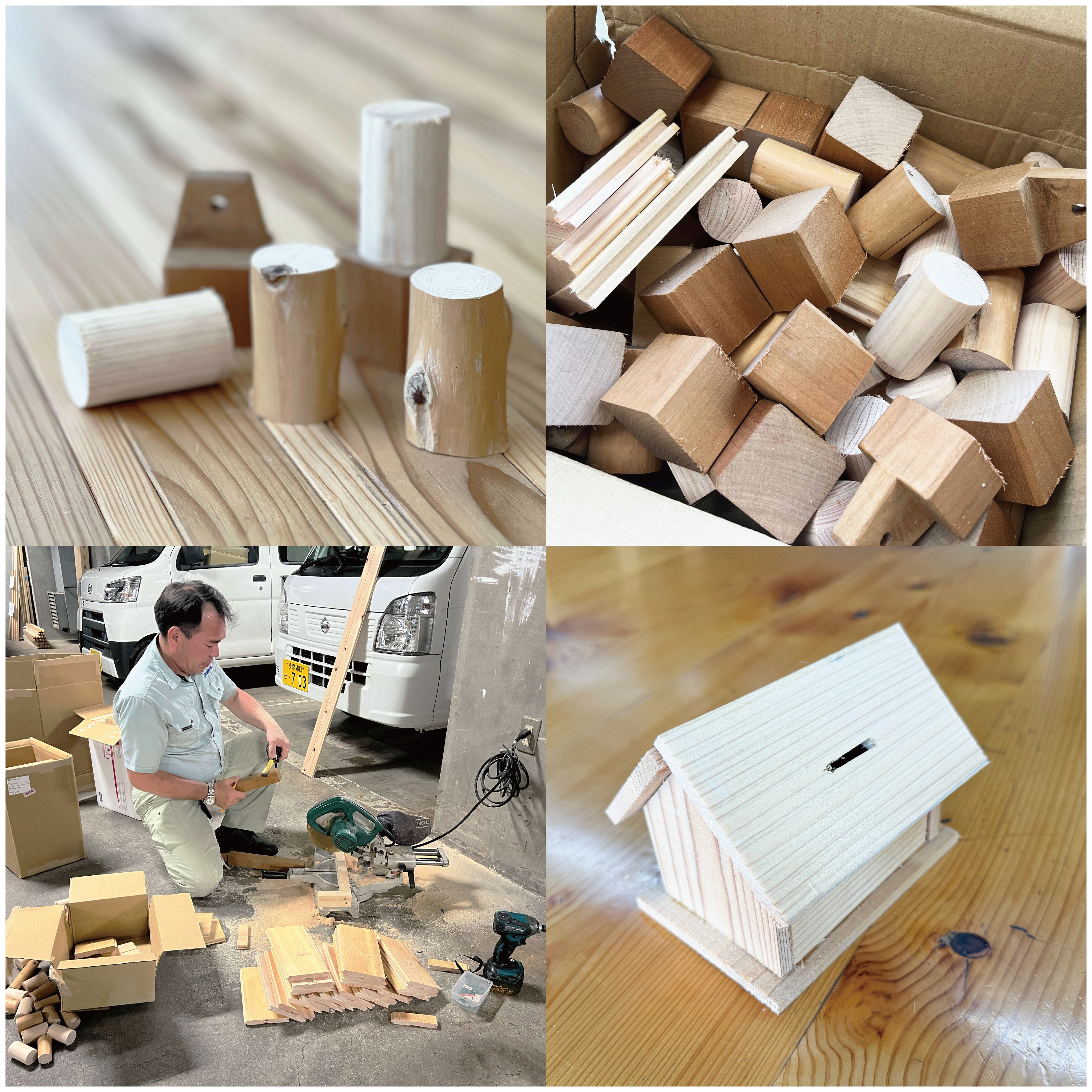 木工チャレンジで提供させていただく木材については、建築現場で大工さんがカットした木材や、現場で使われなかった端材を集めて、東京の木「TOKYO WOOD」のスギ、ヒノキの木など、東京産の木材をお配りします。子供たちの創意工夫によって、使われることのない端材が素敵な作品に生まれ変わるのを楽しみにしています。