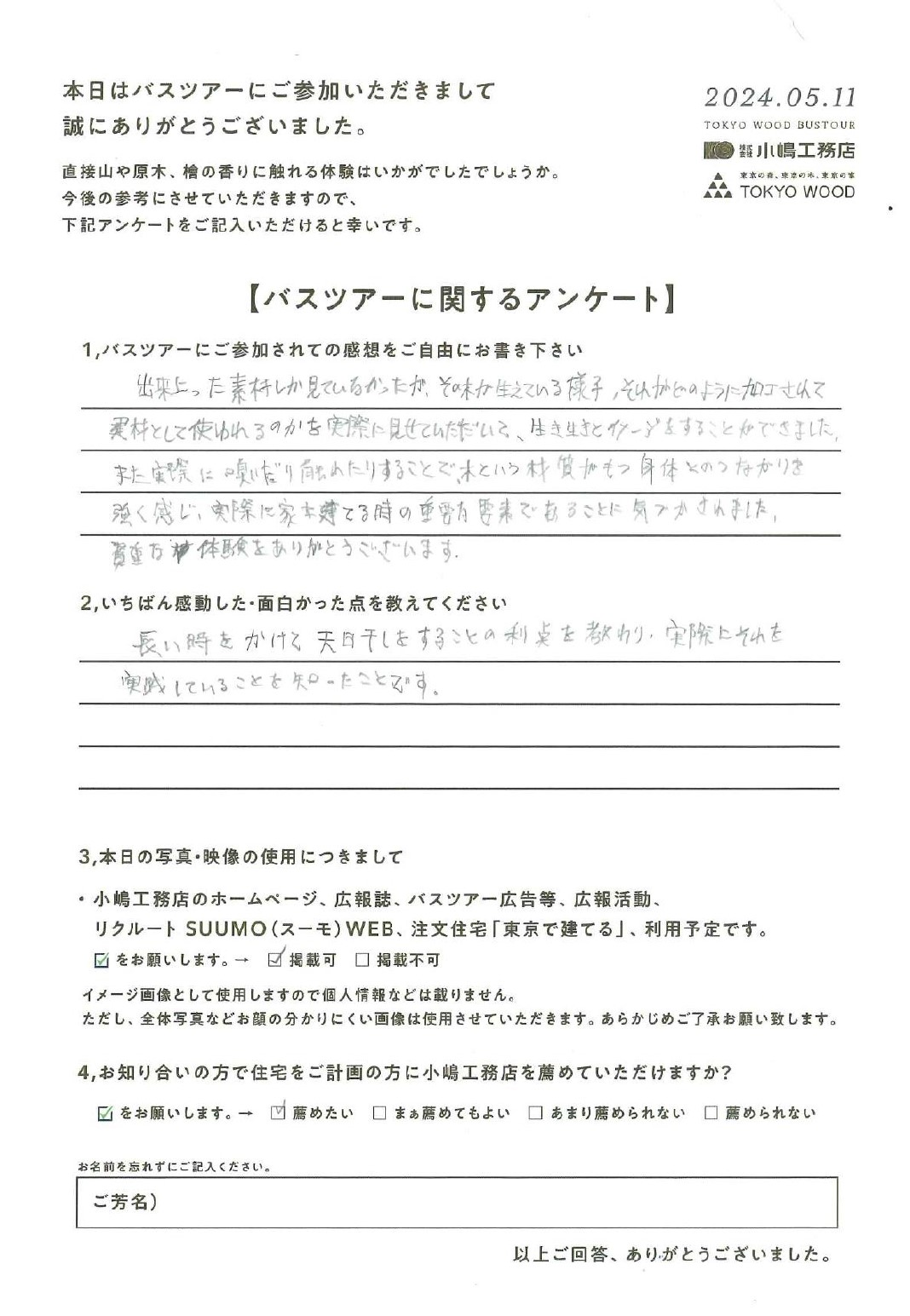 「TOKYO WOODバスツアー」のお客様アンケートは、現在準備中です。