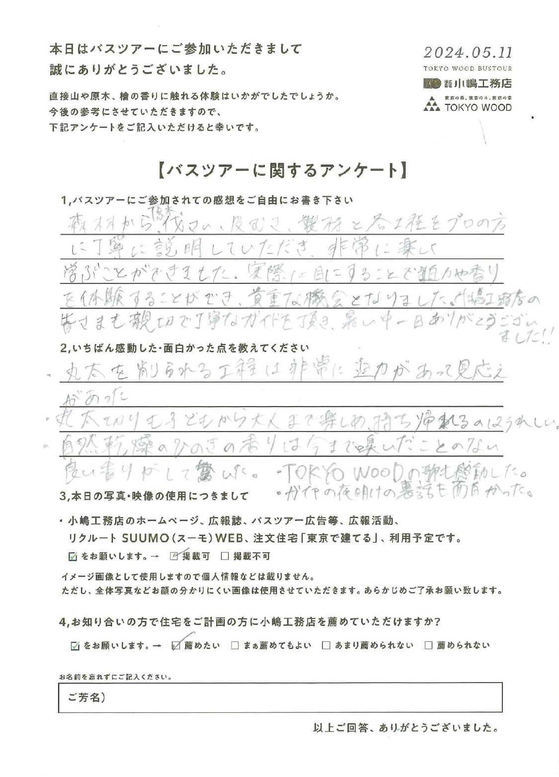 「TOKYO WOODバスツアー」のお客様アンケートは、現在準備中です。