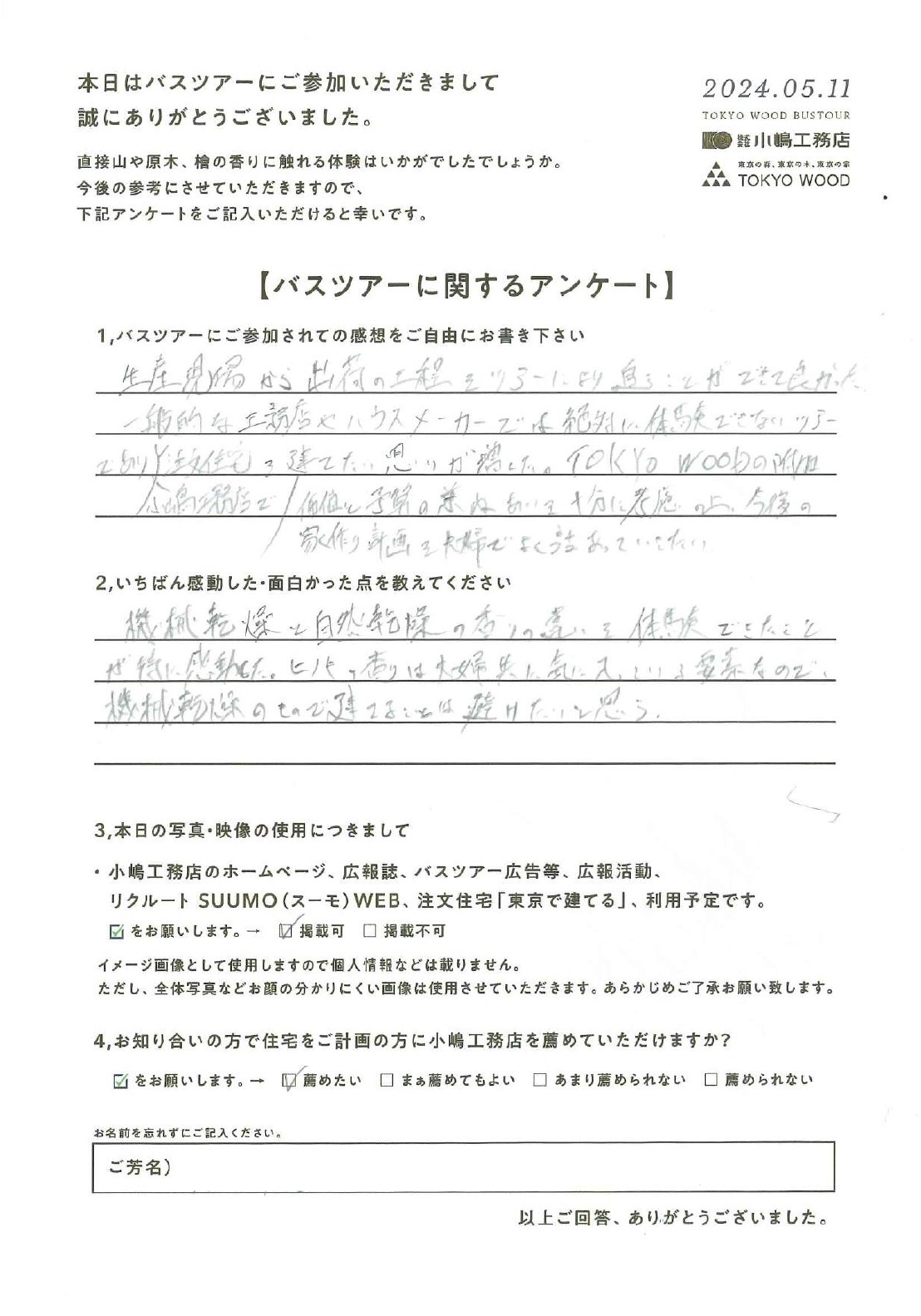 生産現場から出荷の工程をツアーにより追うことが良かった。一般的な工務店やハウスメーカーでは絶対に体験できないツアーであり、小嶋工務店で注文住宅を建てたい思いが増した。TOKYO WOODの付加価値と予算の兼ねあいを十分に考慮の上、今後の家作り計画を夫婦でよく話あっていきたい。