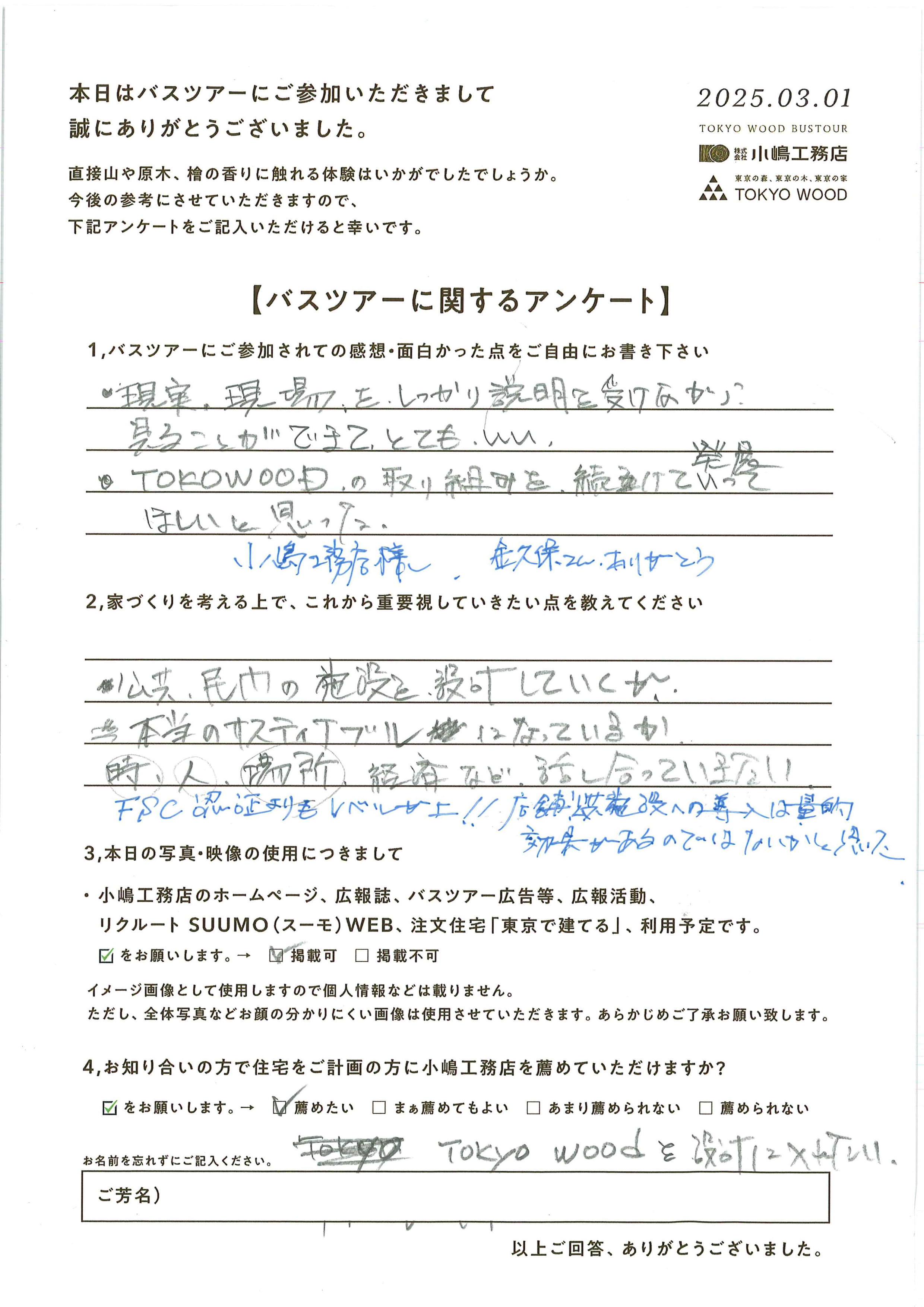 「TOKYO WOODバスツアー」のお客様アンケートは、現在準備中です。