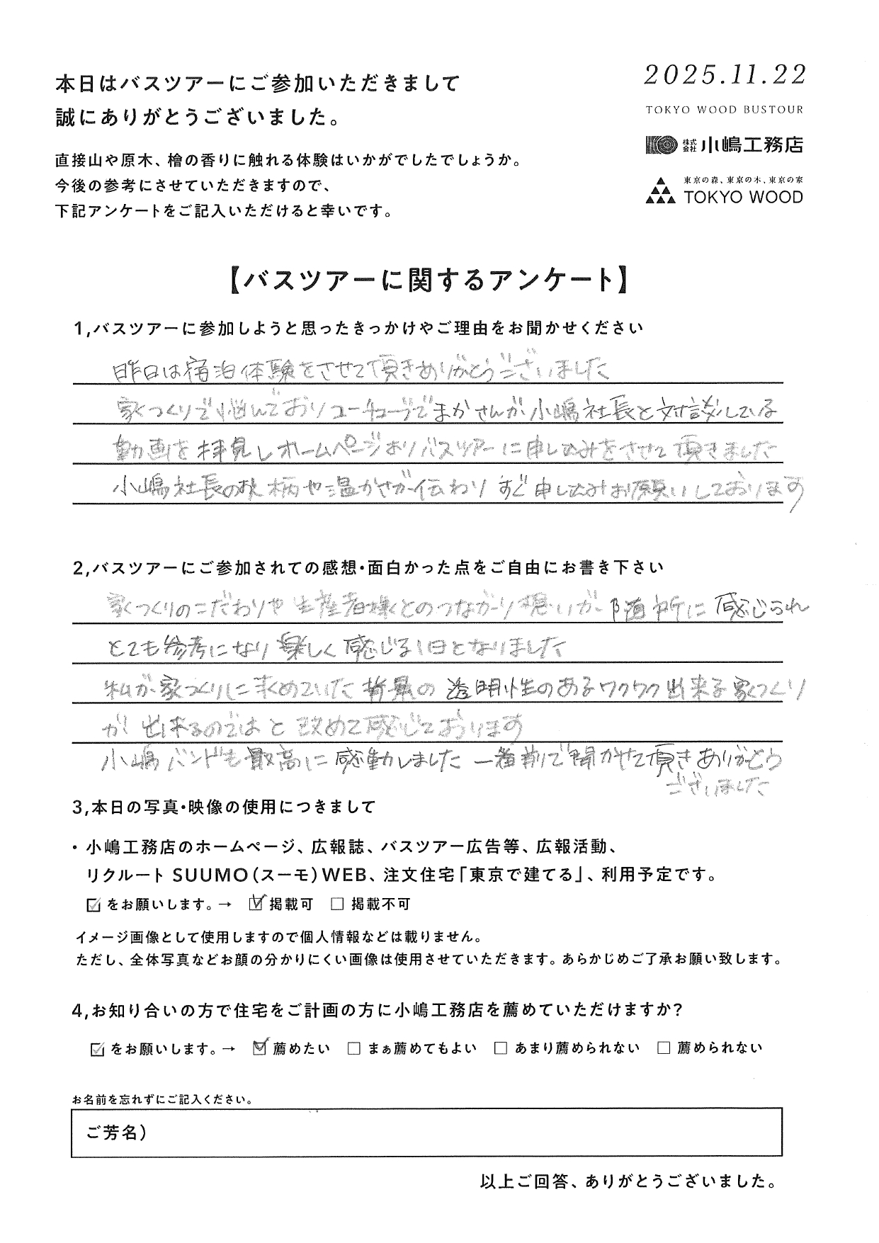 「TOKYO WOODバスツアー」のお客様アンケートは、現在準備中です。