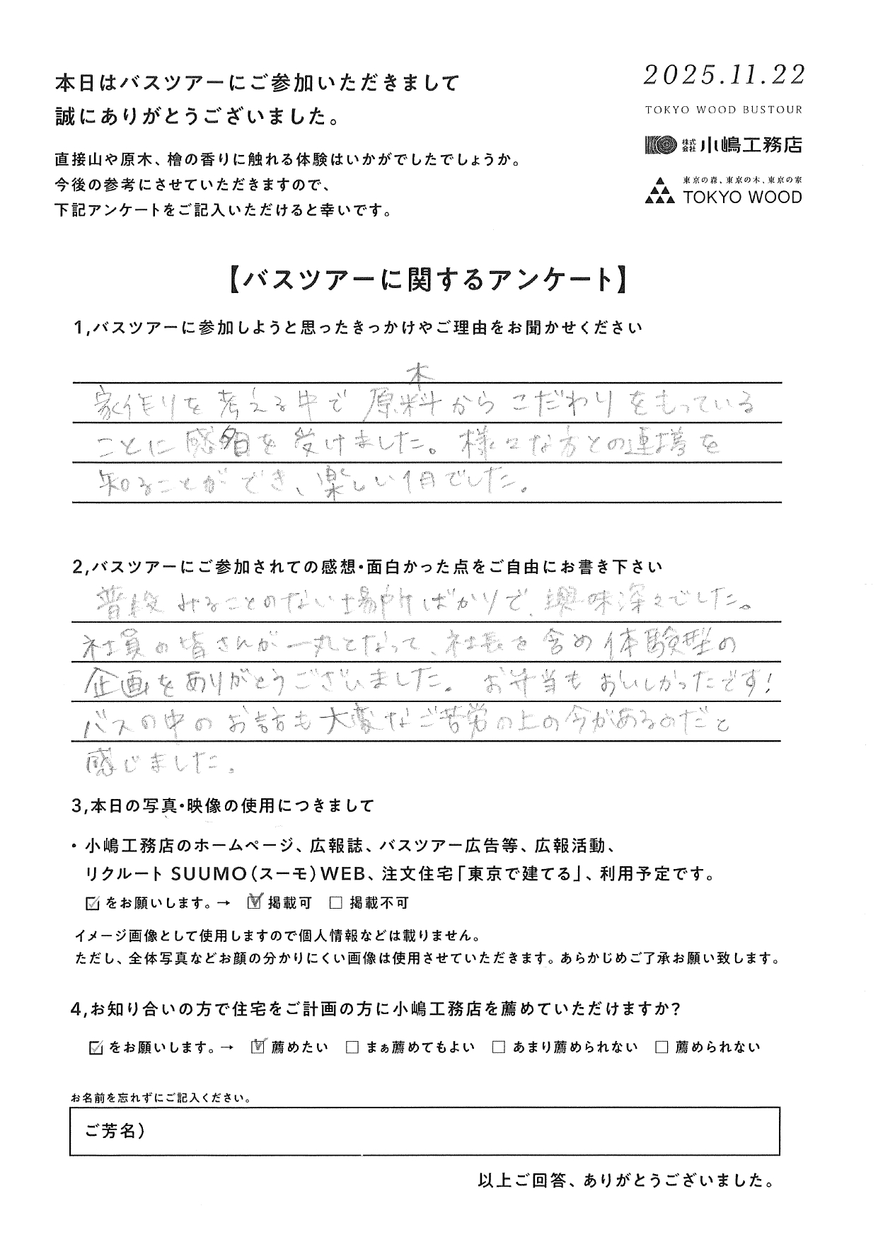 「TOKYO WOODバスツアー」のお客様アンケートは、現在準備中です。