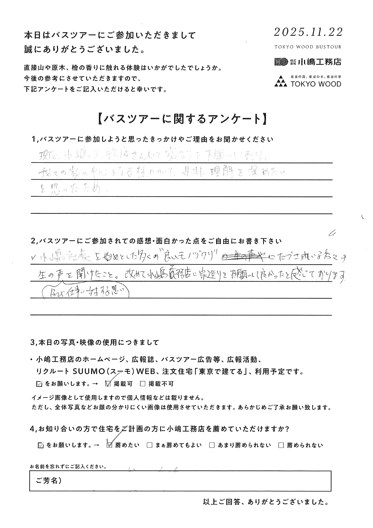 TOKYO WOODバスツアー ”良いモノヅクリ”にたずさわる方々の生の声が聞けた M様 バスツアーにご参加しようと思ったきっかけやご理由をお聞かせください。 現在小嶋工務店さんにて家造りをお願いしており、我々の家の中心となる柱についてぜひ理解を深めたいと思ったため。 バスツアーに参加されての感想・面白かった点をご自由にお書きください。 小嶋社長を始めとした多くの”良いモノヅクリ”にたずさわっている方々の生の声及び仕事に対する思いを聞けたこと。改めて小嶋工務店に家造りをお願いして良かったと感じております。