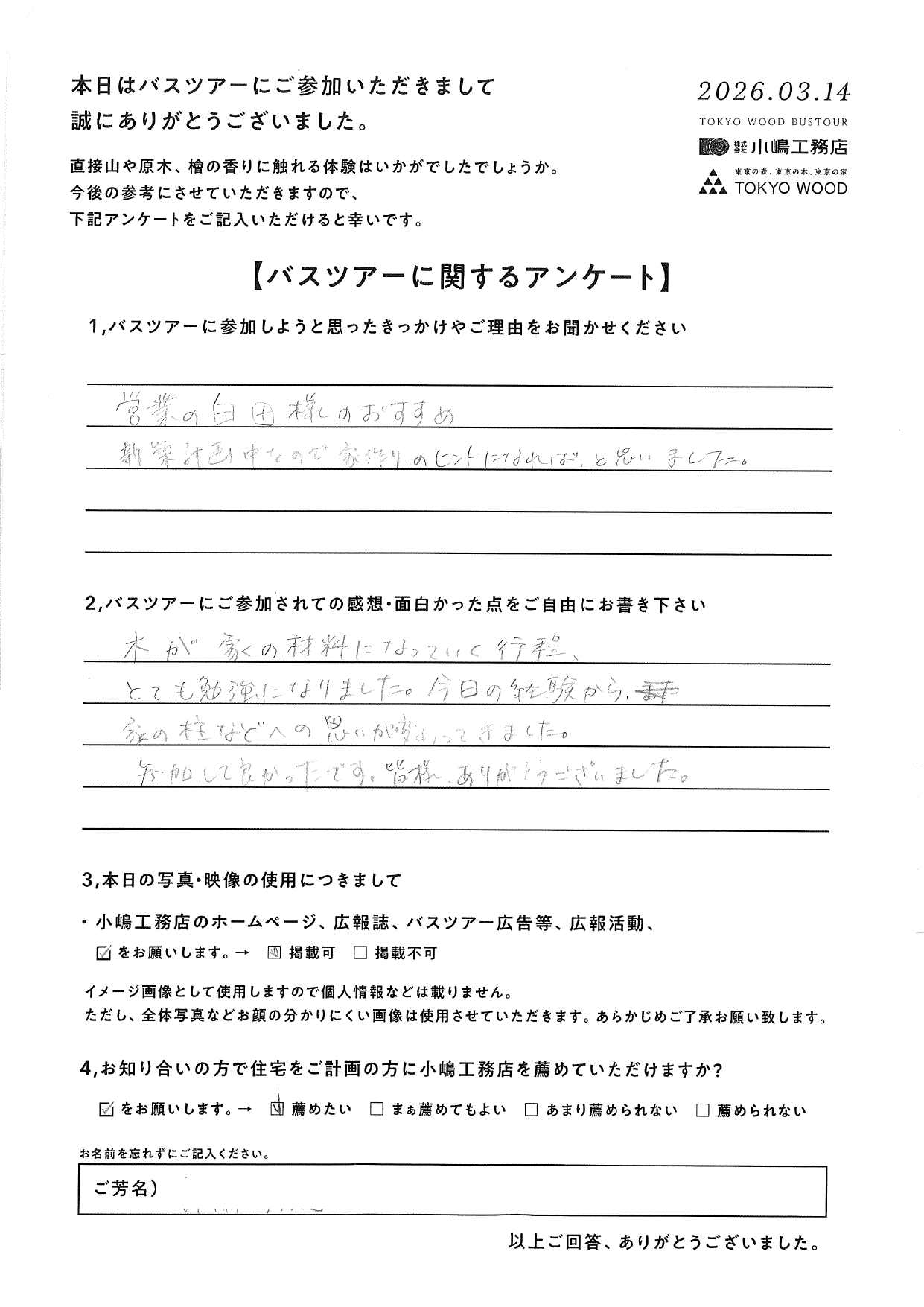 TOKYO WOODバスツアー 木が家の材料になっていく工程、とても勉強になりました! I様 バスツアーにご参加しようと思ったきっかけやご理由をお聞かせください。 営業の白田様のおすすめ。 新築計画中なので家づくりのヒントになればと思いました。 バスツアーに参加されての感想・面白かった点をご自由にお書きください。 木が家の材料になっていく工程、とても勉強になりました。今日の経験から家の柱などへの思いが変わってきました。 参加して良かったです。皆様ありがとうございました。