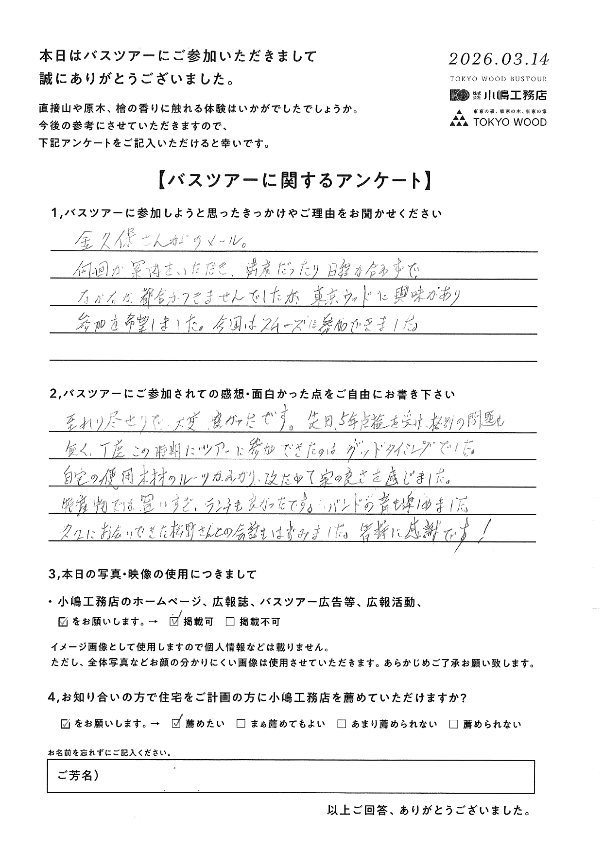 「TOKYO WOODバスツアー」のお客様アンケートは、現在準備中です。