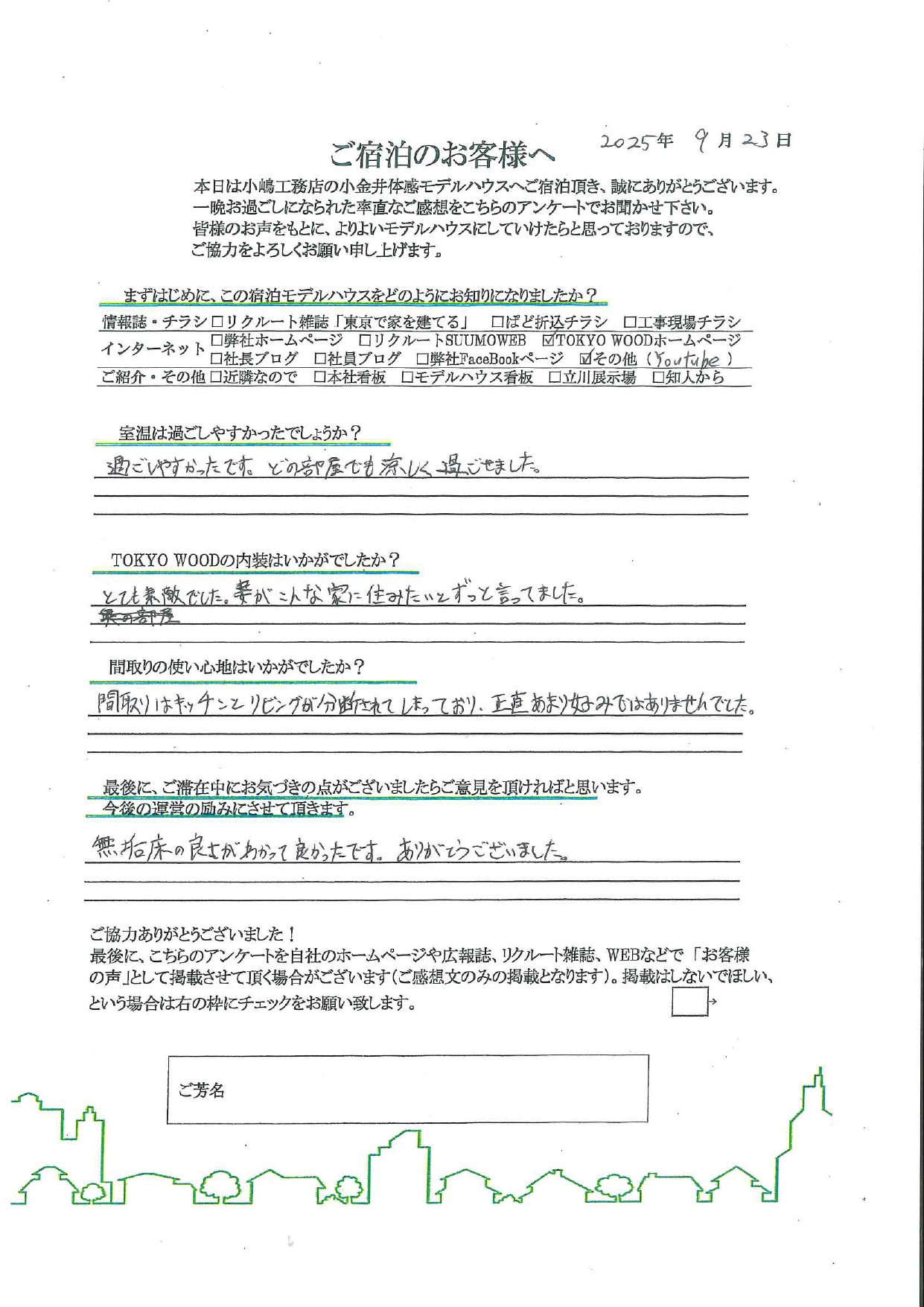 モデルハウス宿泊体験 こんな家に住みたい K様 室温は過ごしやすかったでしょうか? 過ごしやすかったです。どの部屋でも涼しく過ごせました。 TOKYO WOODの内装はいかがでしたか? とても素敵でした。妻がこんな家に住みたいとずっと言ってました。 間取りの使い心地はいかがでしたか? 間取りはキッチンとリビングが分断されてしまっており、正直あまり好みではありませんでした。 ご滞在中にお気づきの点がございましたらご意見を頂ければと思います。 無垢床の良さがわかって良かったです。ありがとうございました。