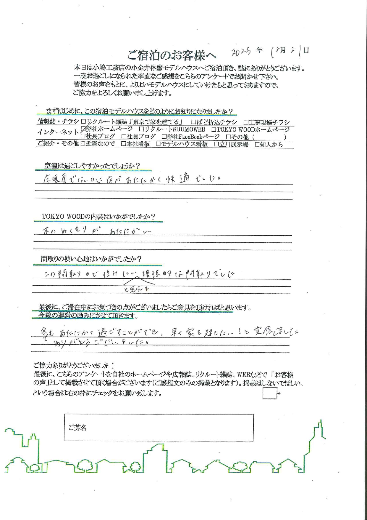 モデルハウス宿泊体験 床暖房でないのに床があたたかく快適! A様 室温は過ごしやすかったでしょうか? 床暖房ではないのに床があたたかく快適でした。 TOKYO WOODの内装はいかがでしたか? 木のぬくもりがあたたかい 間取りの使い心地はいかがでしたか? この間取りで住みたいと思える理想的な間取りでした。 ご滞在中にお気づきの点がございましたらご意見を頂ければと思います。 冬でもあたたかく過ごすことができ、早く家を建てたい!と実感しました。 ありがとうございました。