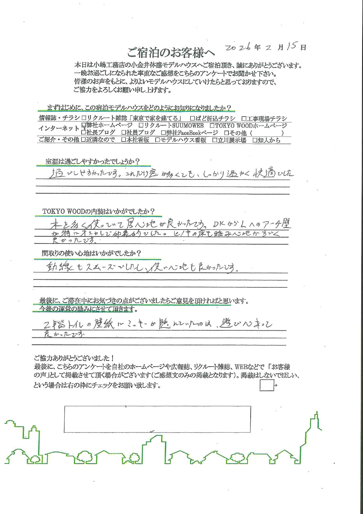 モデルハウス宿泊体験 ヒノキの床の踏み心地が良かった! F様 室温は過ごしやすかったでしょうか? 過ごしやすかったです。これだけ窓が多くても、しっかり温かく快適でした。 TOKYO WOODの内装はいかがでしたか? 木を多く使っていて居心地が良かったです。DLからLへのアーチ壁が特にオシャレで印象的でした。ヒノキの床も踏み心地がすごく良かったです。 間取りの使い心地はいかがでしたか? 動線もスムーズでしたし使い心地も良かったです。 ご滞在中にお気づきの点がございましたらご意見を頂ければと思います。 2階トイレの壁紙にミッキーが隠れていたのは遊び心あってよかったです。
