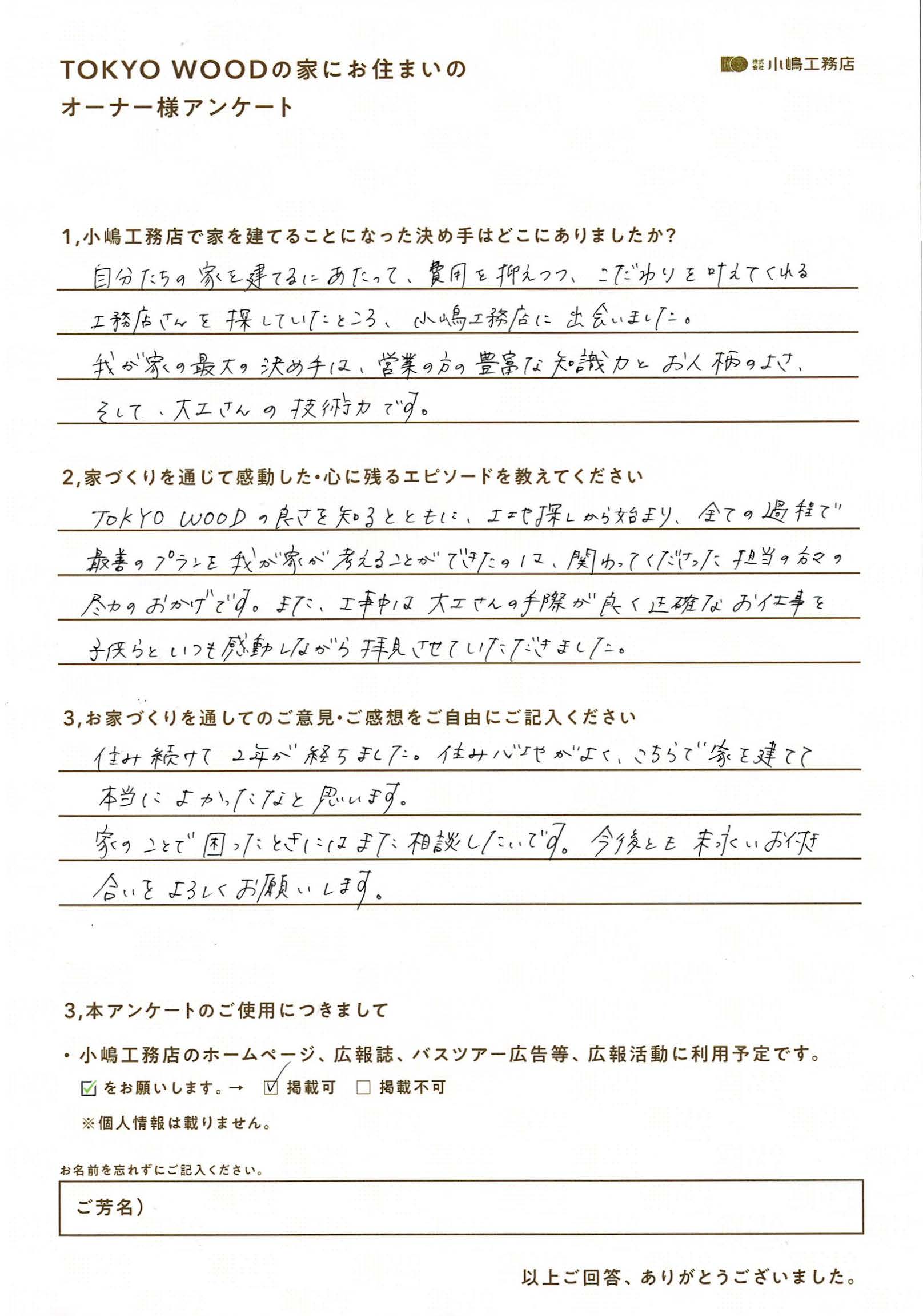 TOKYO WOODの良さを知るとともに、土地探しから始まり、全ての過程で最善のプランを我が家が考えることができたのは、関わってくださった担当の方々の尽力のおかげです。また、工事中は大工さんの手際が良く正確なお仕事を子供らといつも感動しながら拝見させていただきました。