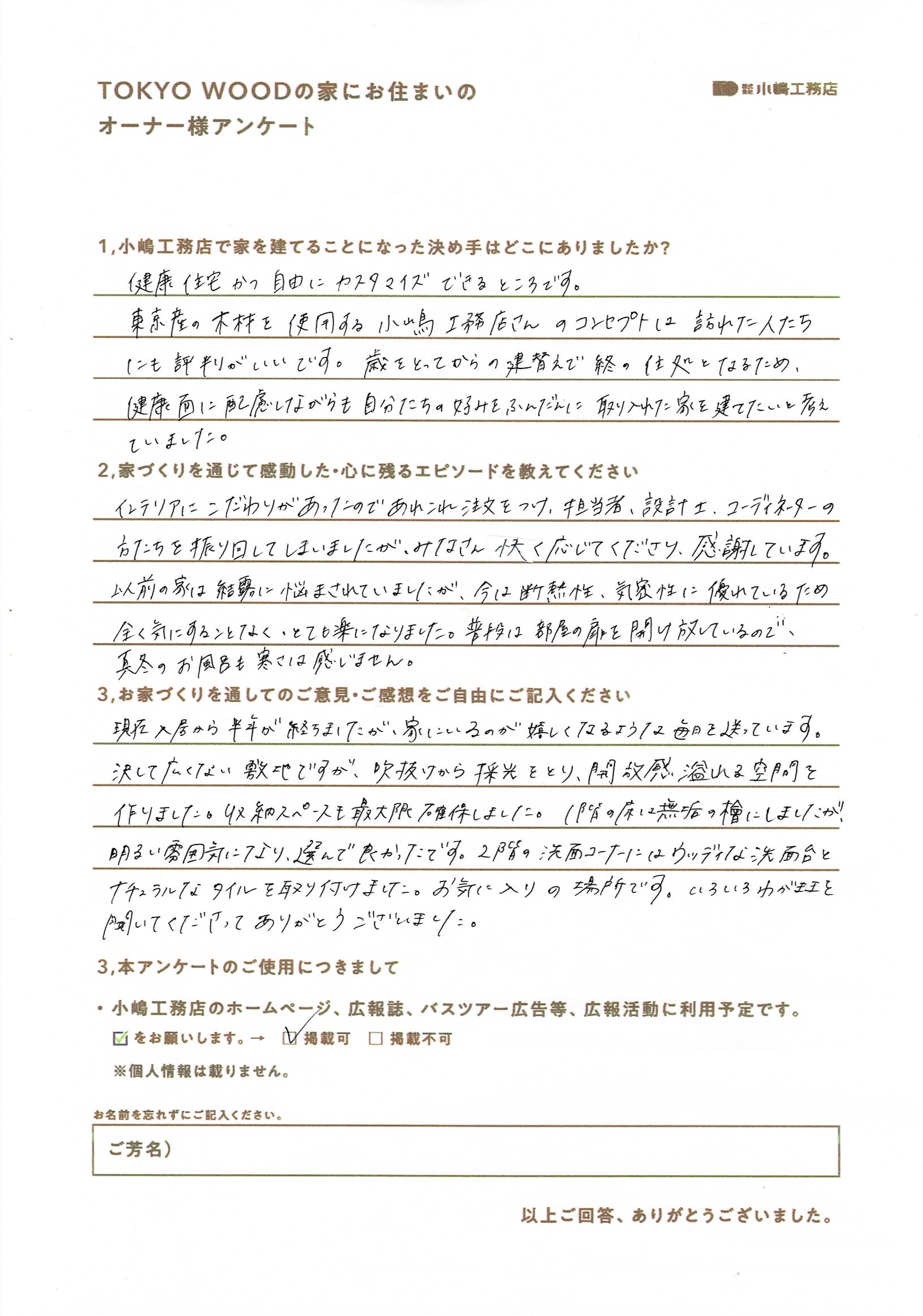 健康住宅かつ自由にカスタマイズできるところです。東京産の木材を使用する小嶋工務店さんのコンセプトは訪れた人たちにも評判がいいです。歳をとってからの建替えで終の住処となるため、健康面に配慮しながらも自分たちの好みをふんだんに取り入れた家を建てたいと考えていました。