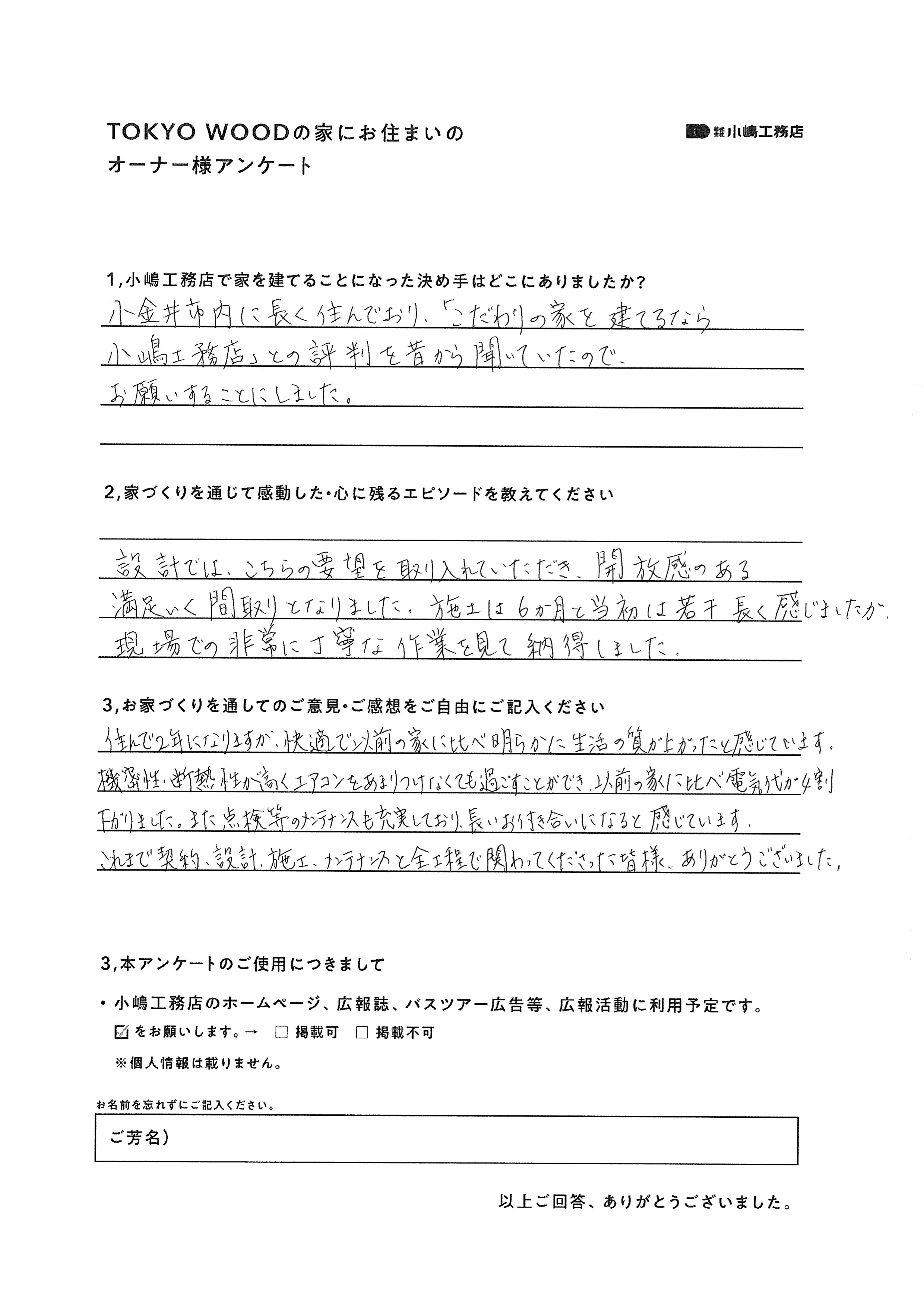 小金井市内に長く住んでおり、「こだわりの家を建てるなら小嶋工務店」との評判を昔から聞いていたので、お願いすることにしました。