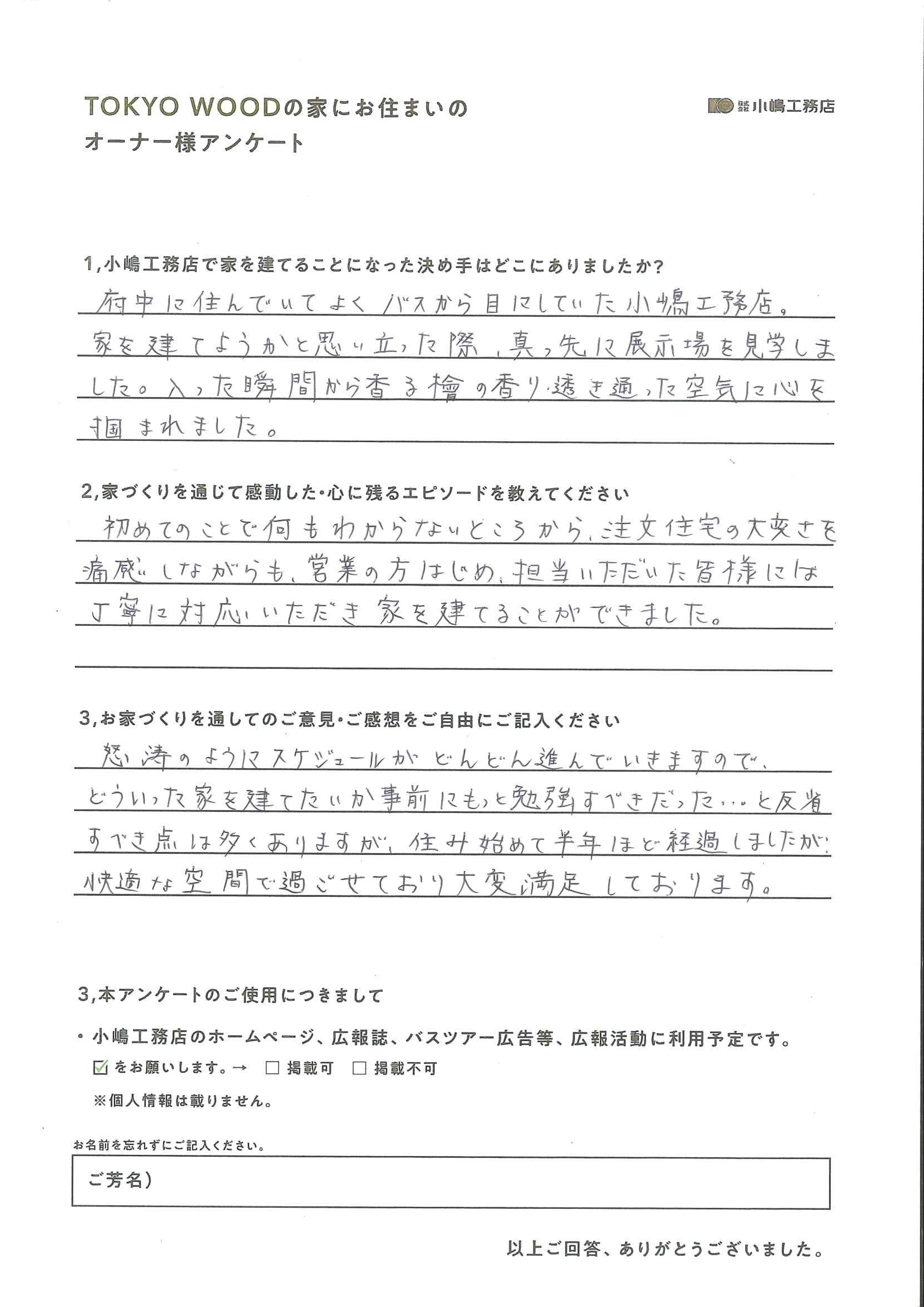 府中に住んでいてよくバスから目にしていた小嶋工務店。家を建てようかと思い立った際、真っ先に展示場を見学しました。入った瞬間から香る檜の香り・透き通った空気に心を掴まれました。