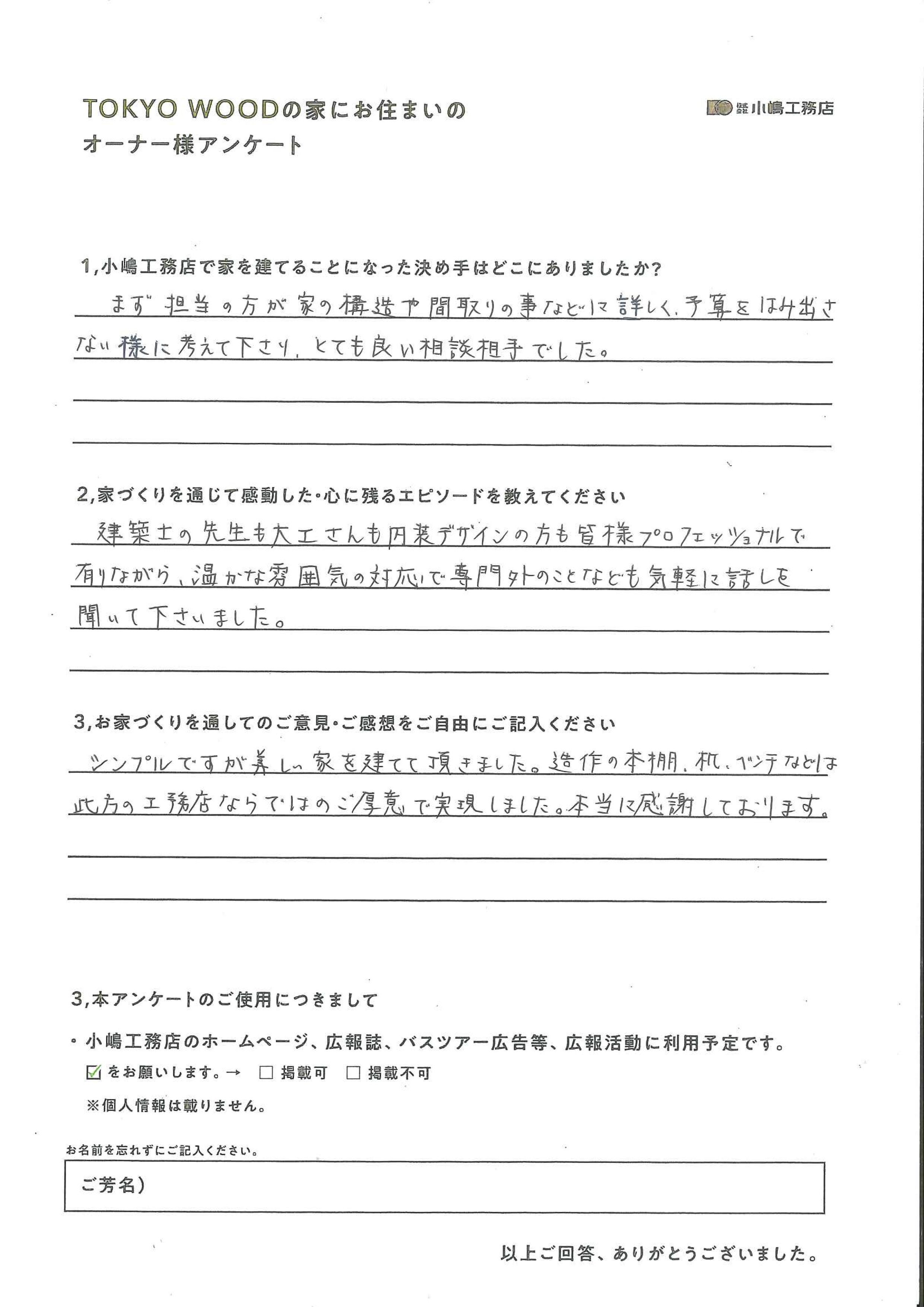 建築士の先生も大工さんも内装デザインの方も皆様プロフェッショナルで有りながら、温かな雰囲気の対応で専門外のことなども気軽に話しを聞いて下さいました。