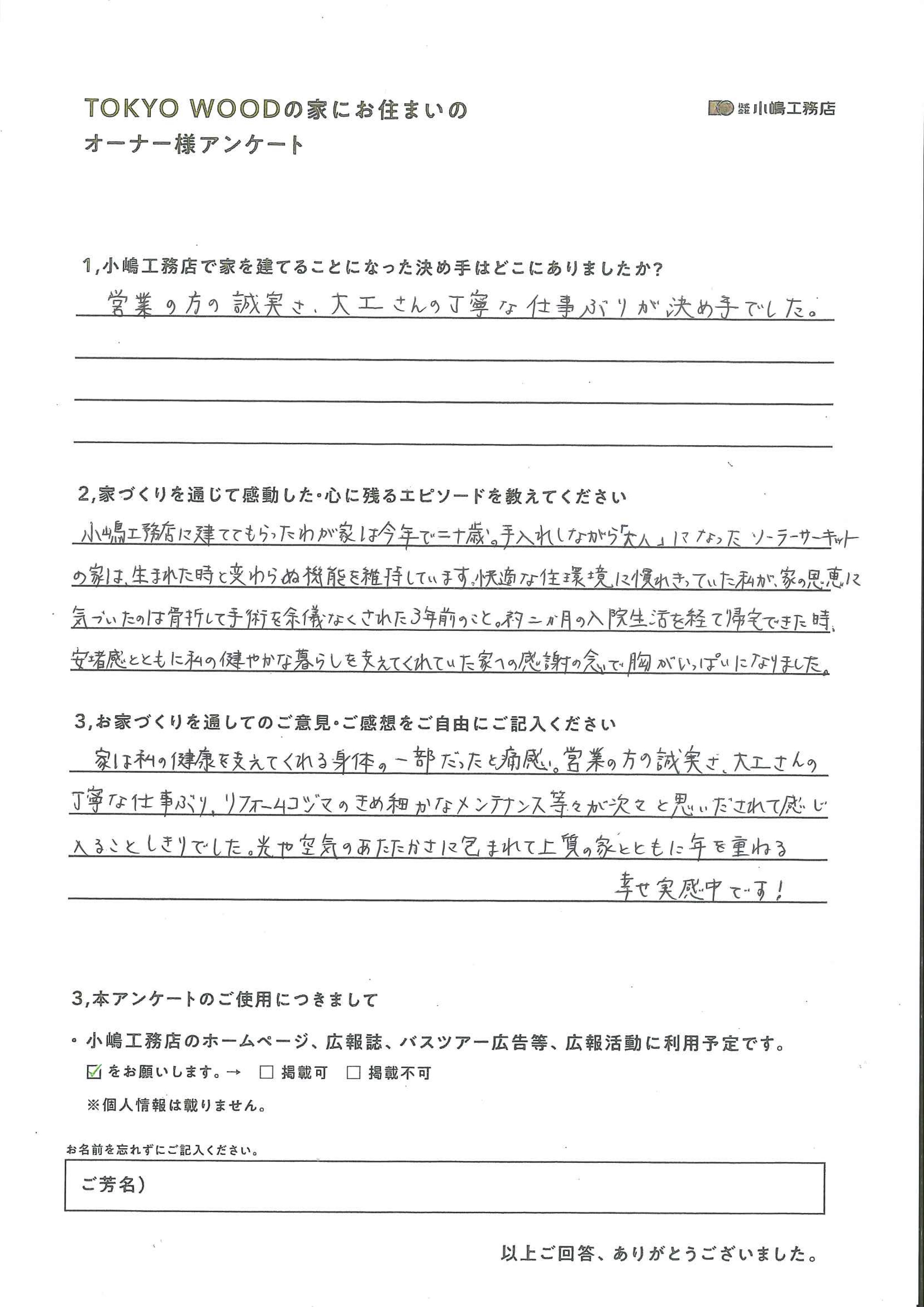 家は私の健康を支えてくれる身体の一部だったと痛感。営業の方の誠実さ、大工さんの丁寧な仕事ぶり、リフォームコジマのきめ細かなメンテナンス等々が次々と思いだされて感じ入ることしきりでした。光や空気のあたたかさに包まれて上質の家とともに年を重ねる幸せを実感中です!