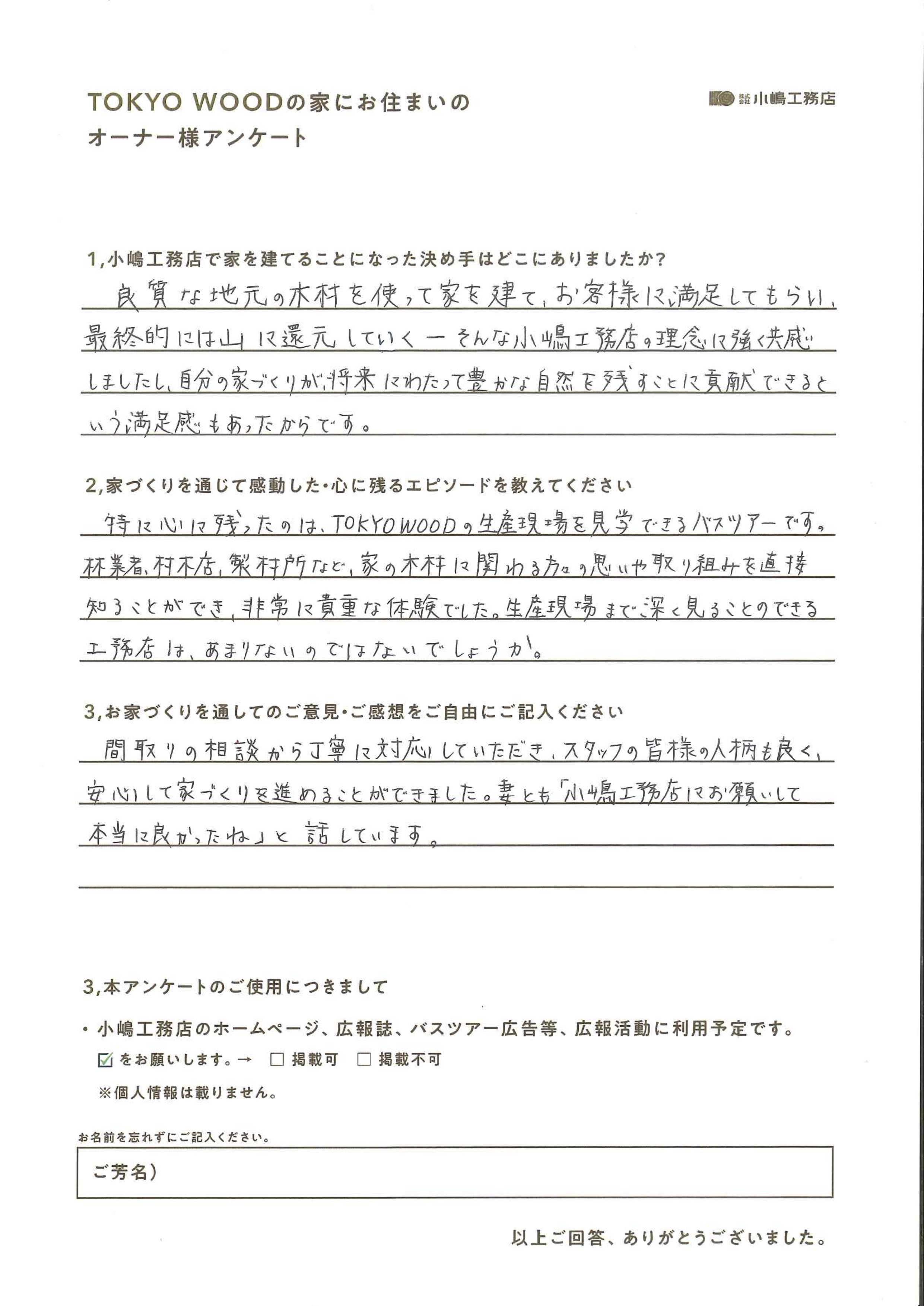 間取りの相談から丁寧に対応していただき、スタッフの皆様の人柄も良く、安心して家づくりを進めることができました。妻とも「小嶋工務店にお願いして本当に良かったね」と話しています。
