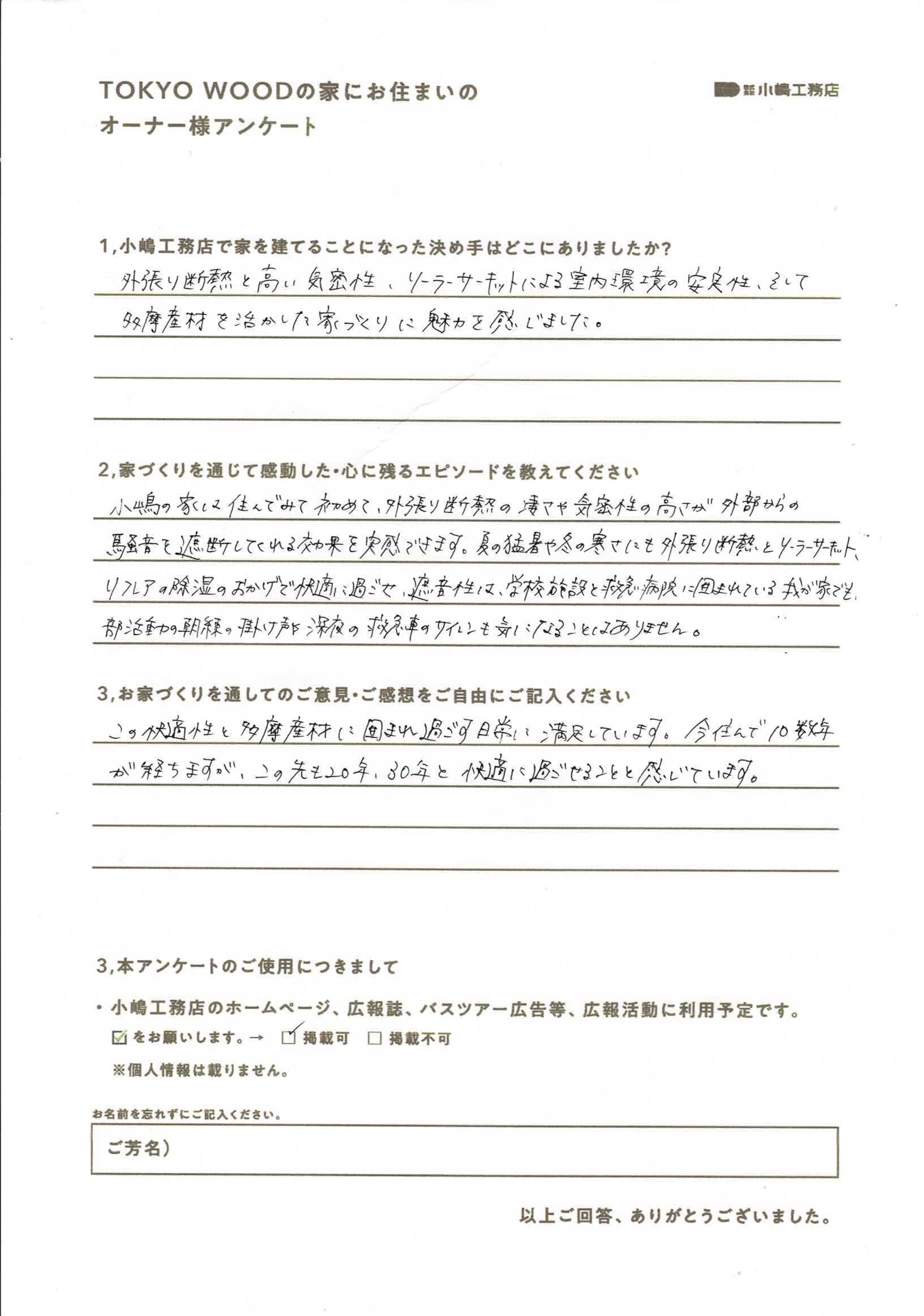 この快適性と多摩産材に囲まれ過ごす日常に満足しています。今住んで10数年が経ちますが、この先も20年、30年と快適に過ごせることと感じています。