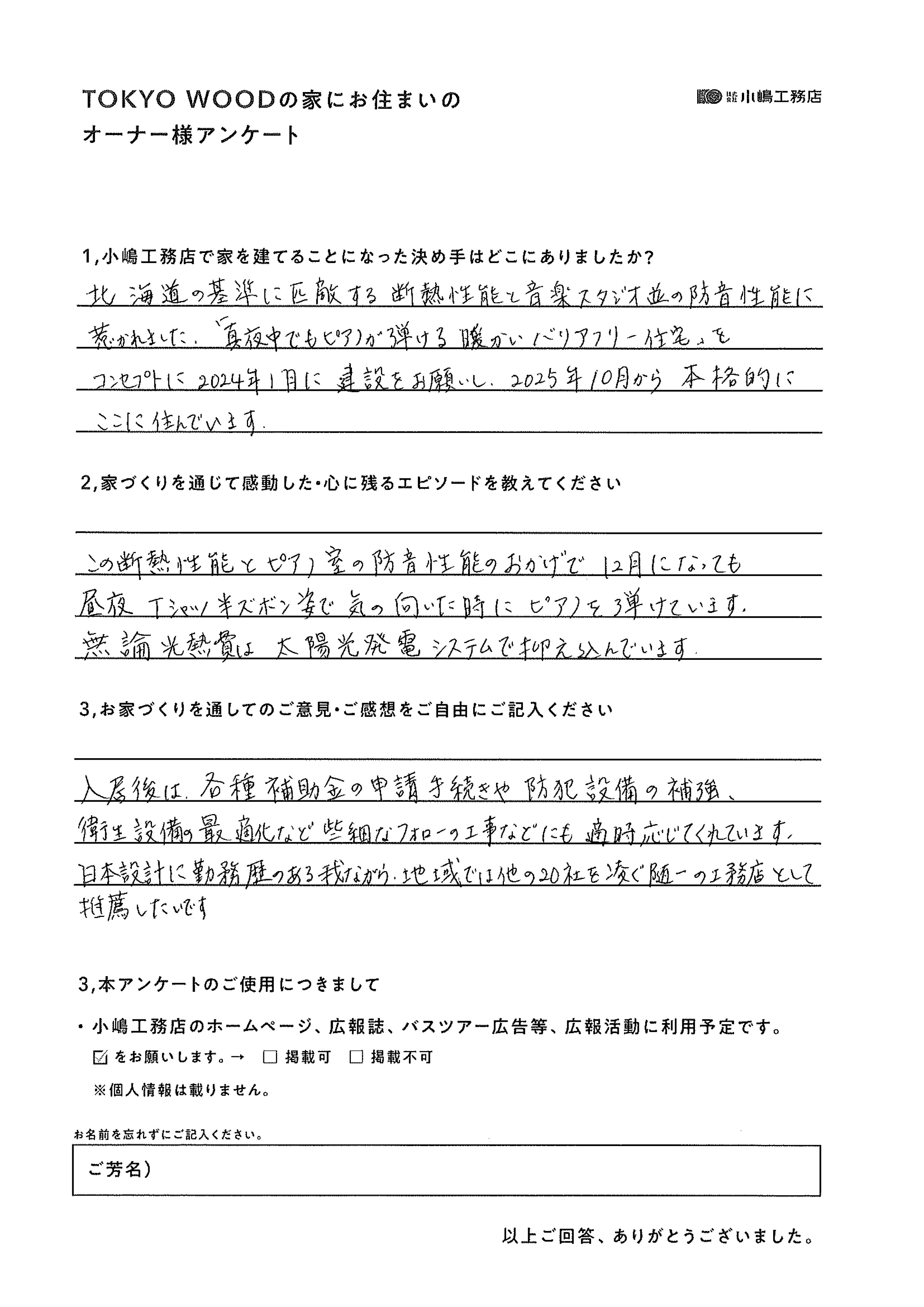 北海道の基準に匹敵する断熱性能と音楽スタジオ並の防音性能に惹かれました。「真夜中でもピアノが弾ける暖かいバリアフリー住宅」をコンセプトに2024年1月に建設をお願いし、2025年10月から本格的にここに住んでいます。