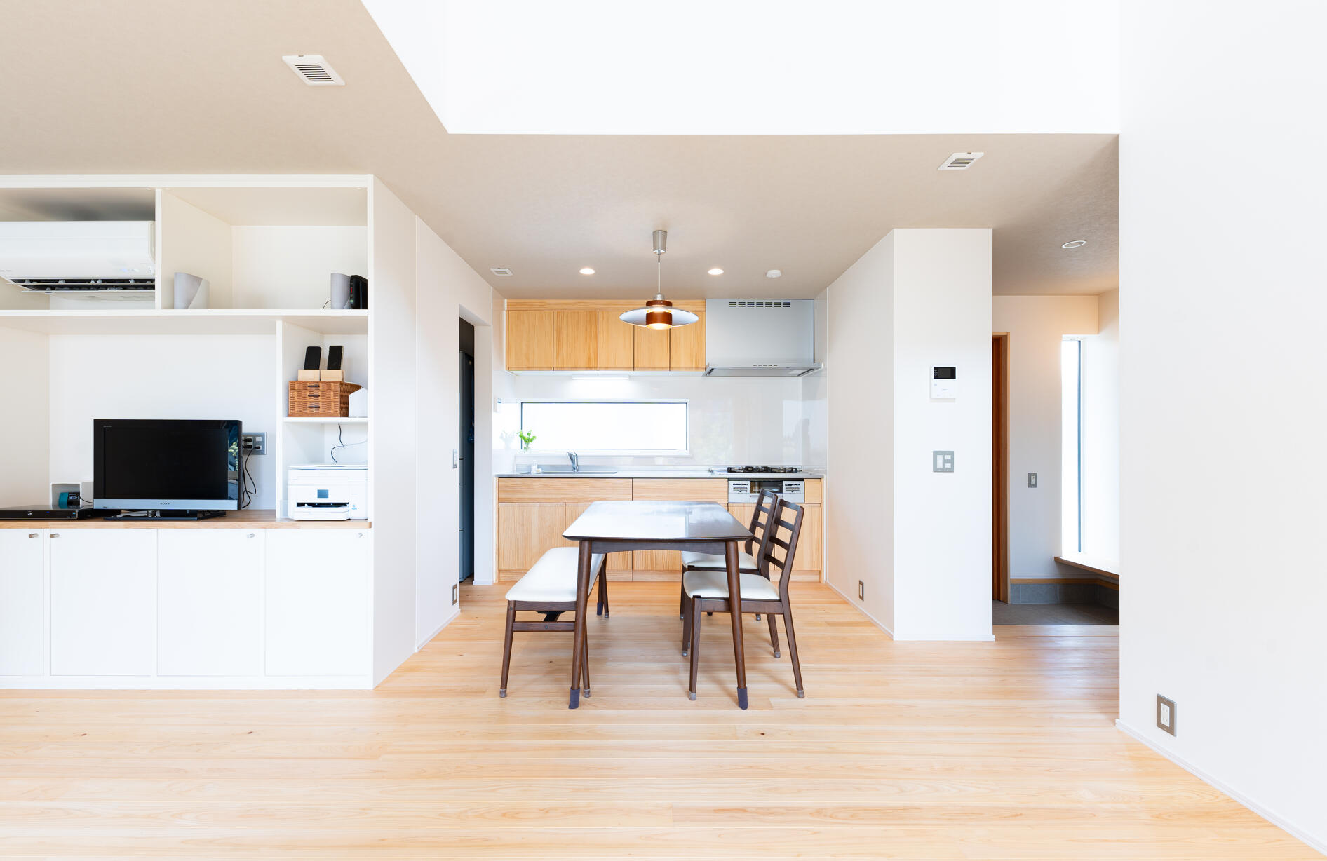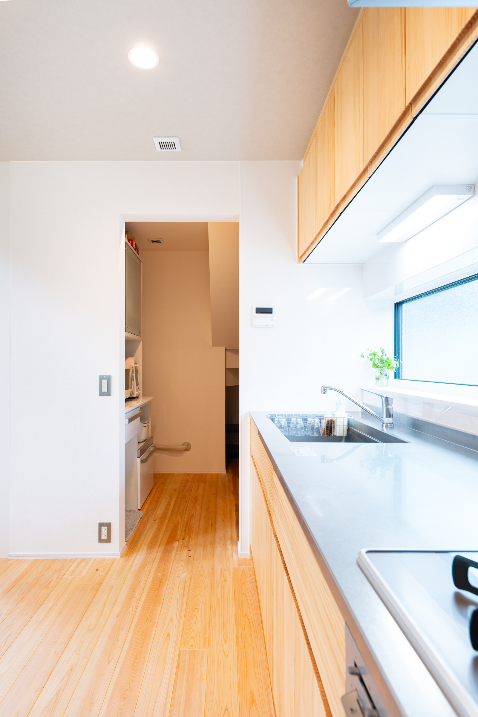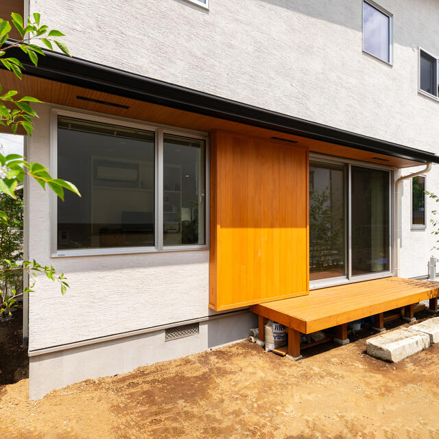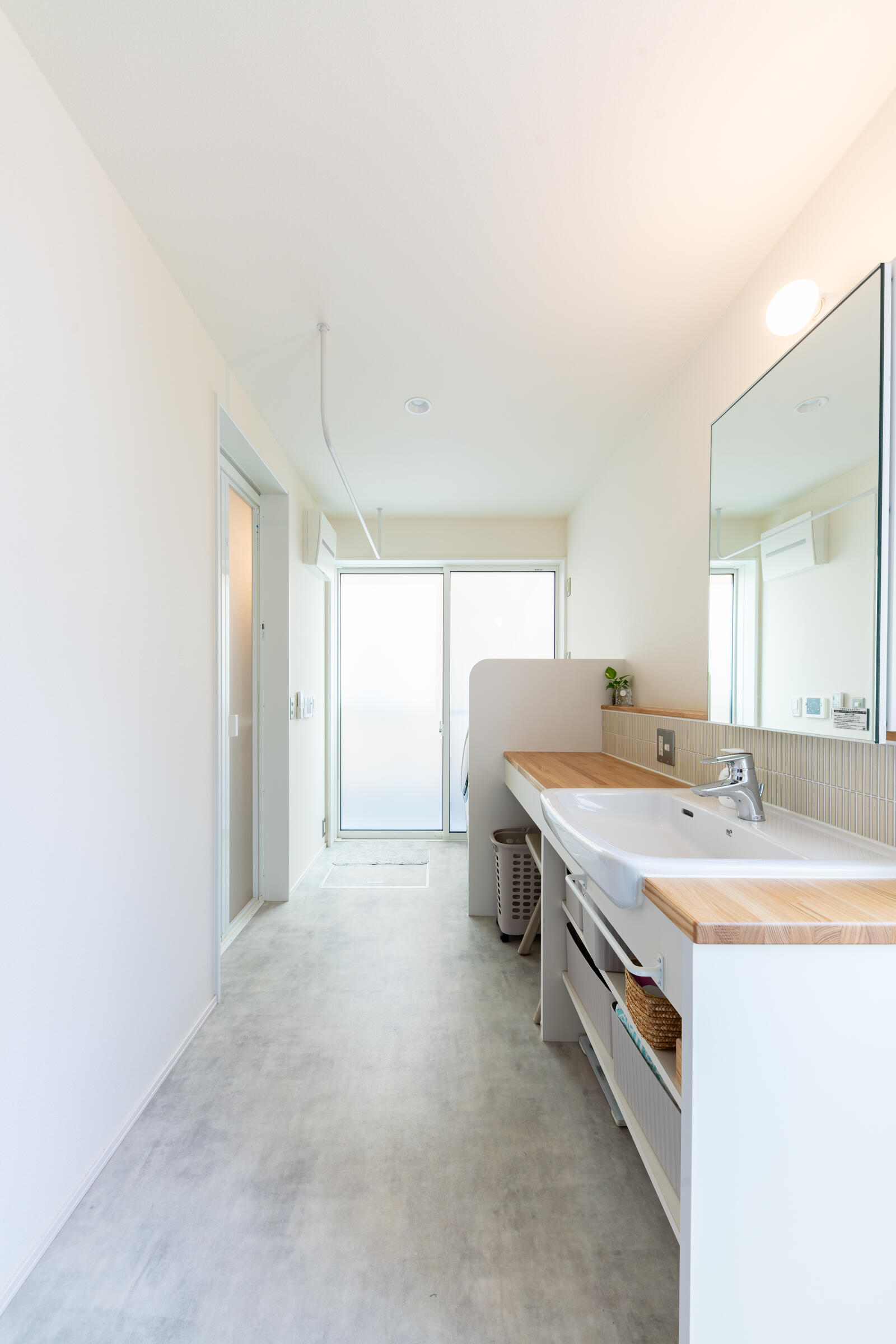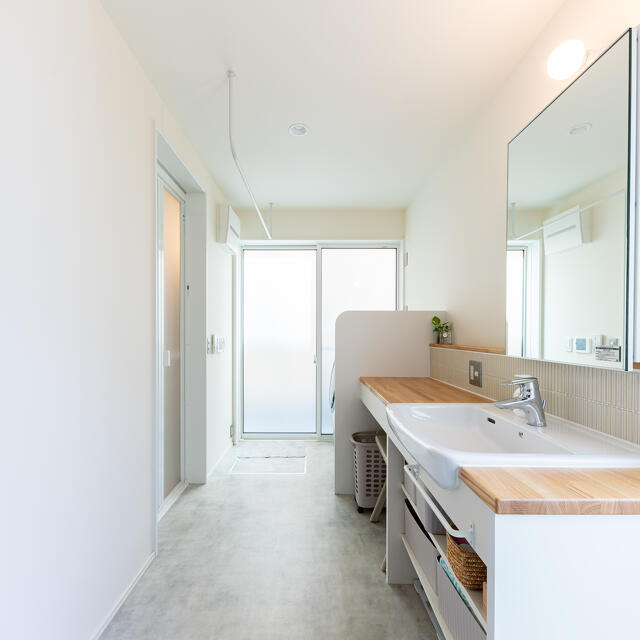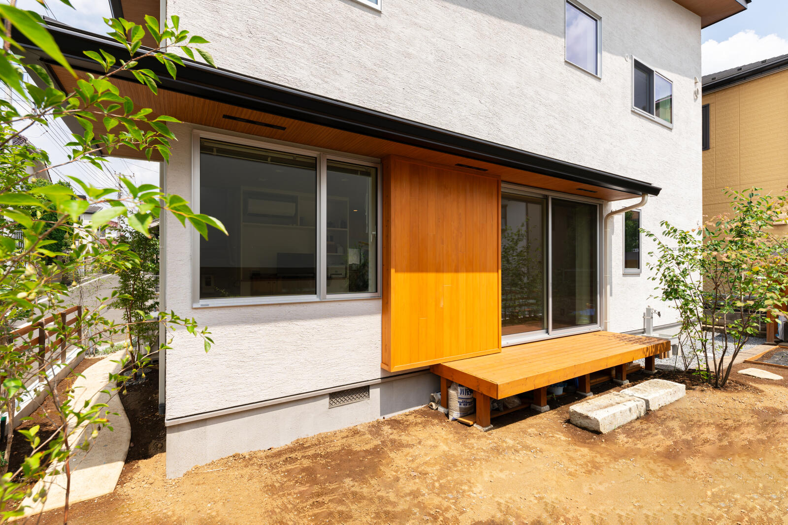 木をたっぷり使うとともに、ご夫婦が希望したのは、シンプルで無駄を省いた家にすること。インテリアは色数を最小限に、余計な家具やインテリアを置かず、エアコンなど生活感のある家電も隠すなど、ミニマルスタイルを徹底。間取りにもその考えが反映されており、吹き抜けのある大空間LDKに、毎日に必要なモノのほとんどを揃えた収納スペース、そしてゆったりとくつろげる洗面脱衣室・浴室で構成された1階は、食事をはじめ、家族団らんやお子さんの勉強、朝・夜の身支度まで、生活のほぼすべてを完結できます。「以前はマンションに住んでいて、何をするにも数歩でできるワンフロアの効率の良さを、建築士さんにそのまま持ち込んでもらいました。」その分、一戸建てならではの“庭”のある暮らしを満喫できるように、リビングには濡れ縁、洗面脱衣室には勝手口、さらに玄関からぐるりと回遊できる動線を設けるなどで、気軽に自然と触れ合えるように工夫されています。
