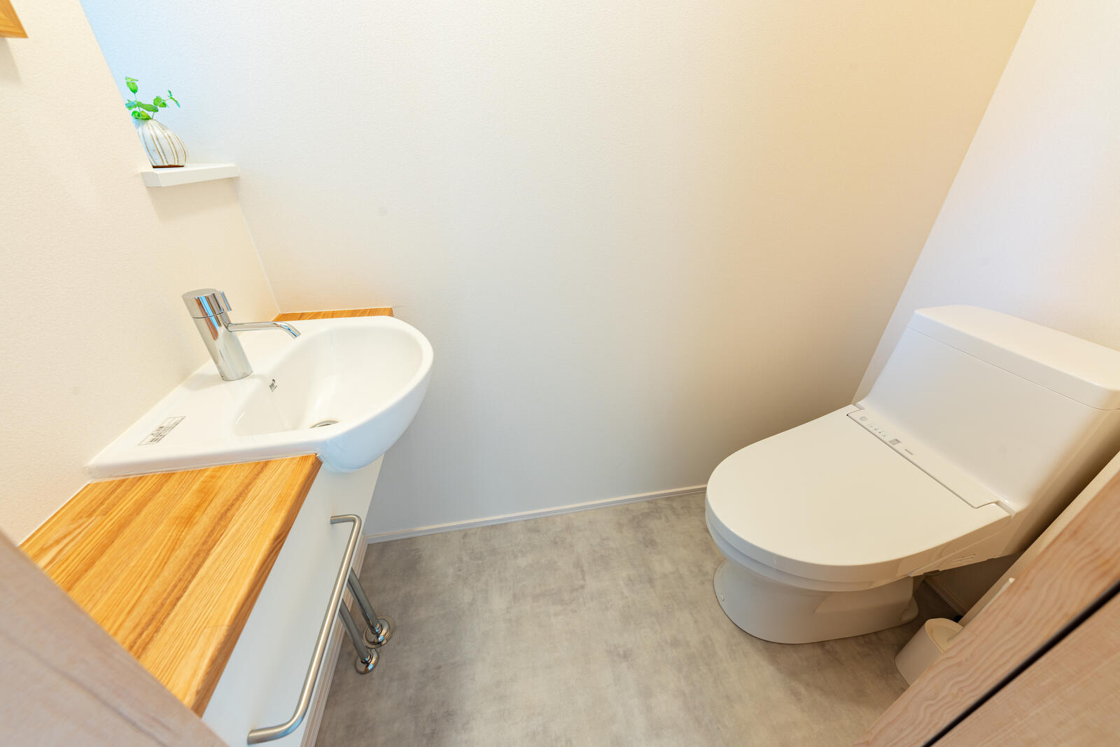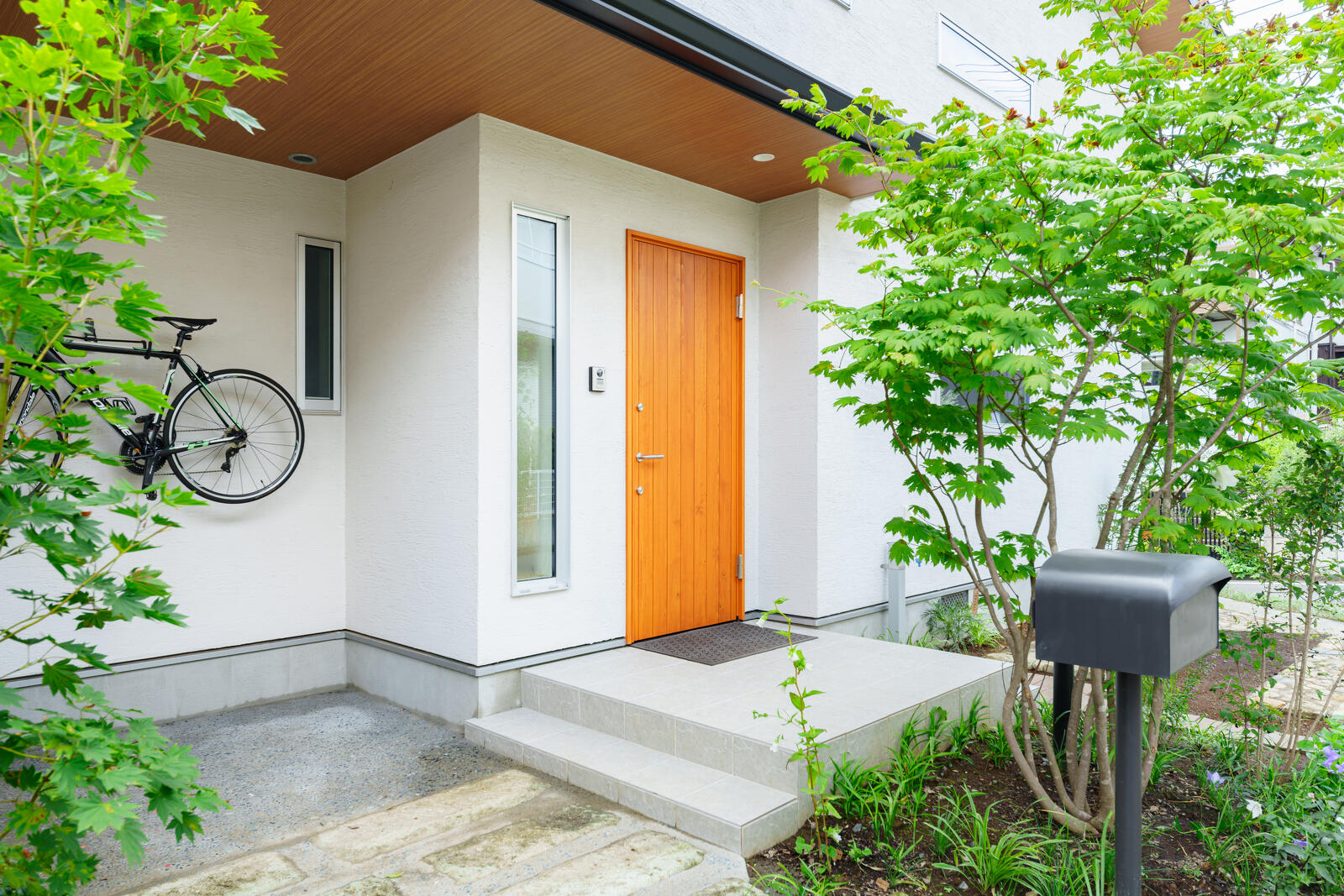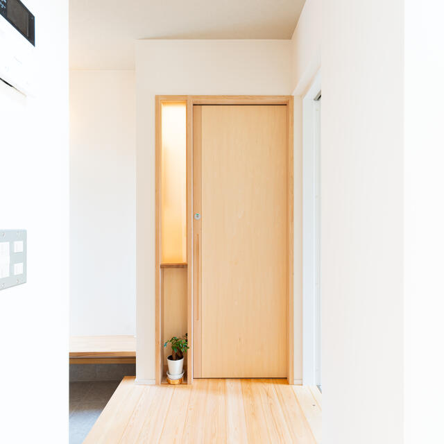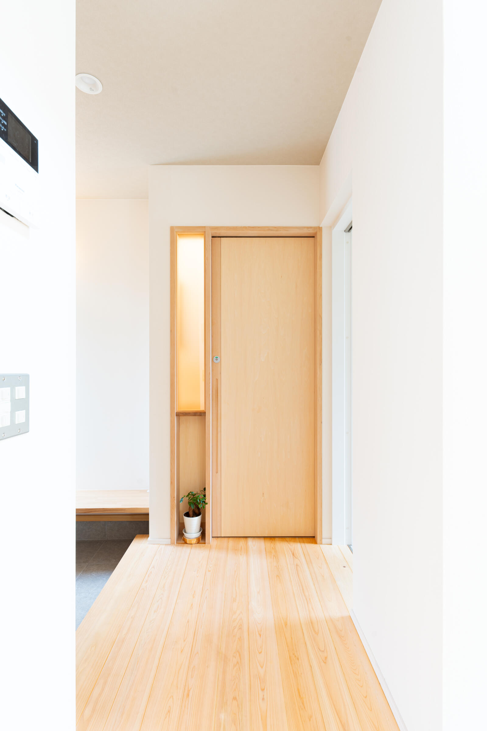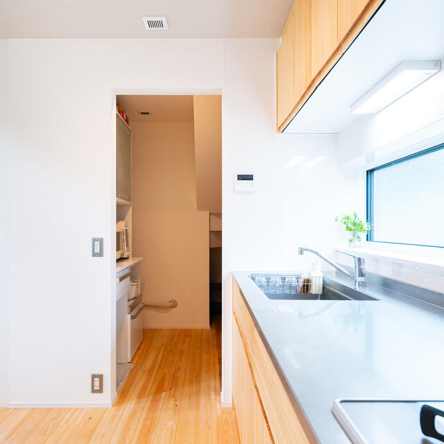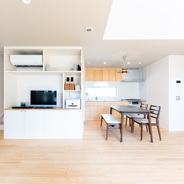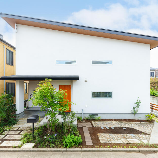 木をたっぷり使うとともに、ご夫婦が希望したのは、シンプルで無駄を省いた家にすること。インテリアは色数を最小限に、余計な家具やインテリアを置かず、エアコンなど生活感のある家電も隠すなど、ミニマルスタイルを徹底。間取りにもその考えが反映されており、吹き抜けのある大空間LDKに、毎日に必要なモノのほとんどを揃えた収納スペース、そしてゆったりとくつろげる洗面脱衣室・浴室で構成された1階は、食事をはじめ、家族団らんやお子さんの勉強、朝・夜の身支度まで、生活のほぼすべてを完結できます。「以前はマンションに住んでいて、何をするにも数歩でできるワンフロアの効率の良さを、建築士さんにそのまま持ち込んでもらいました。」その分、一戸建てならではの“庭”のある暮らしを満喫できるように、リビングには濡れ縁、洗面脱衣室には勝手口、さらに玄関からぐるりと回遊できる動線を設けるなどで、気軽に自然と触れ合えるように工夫されています。