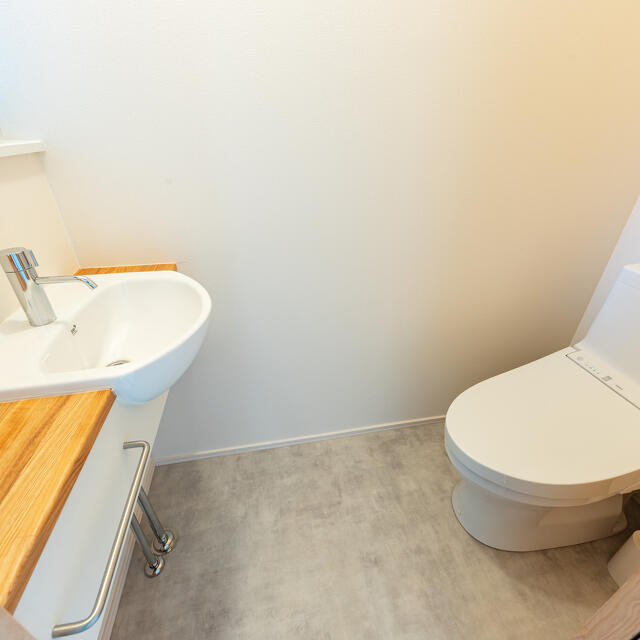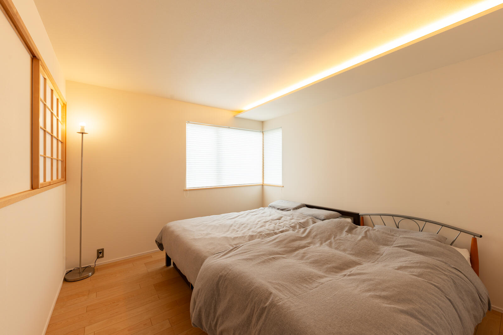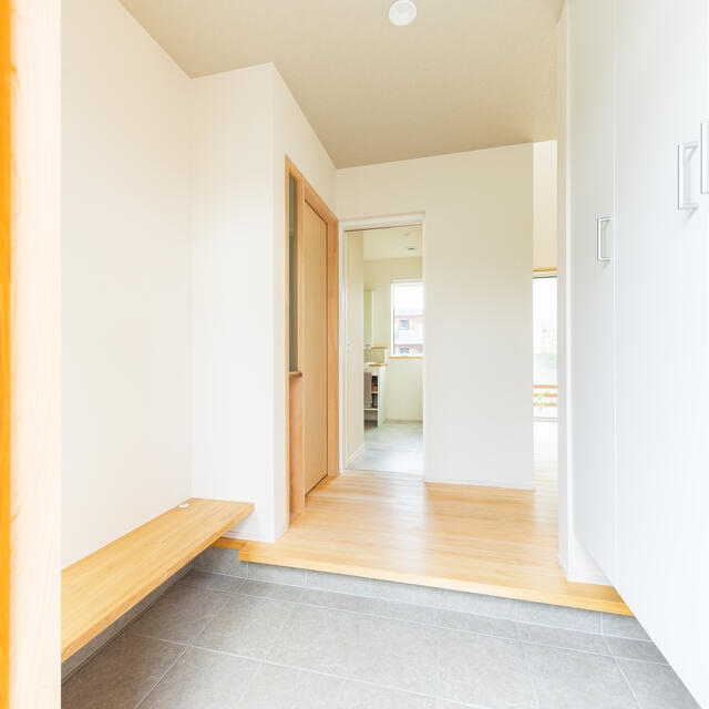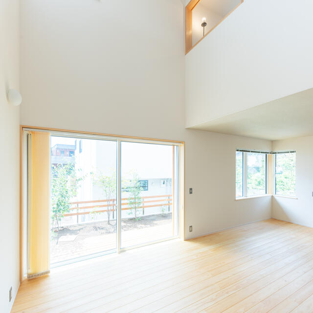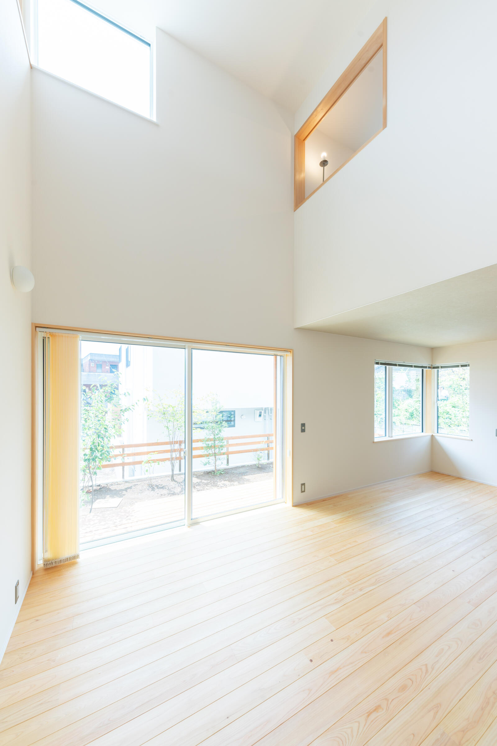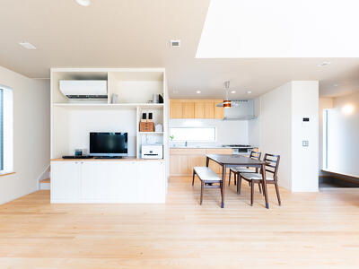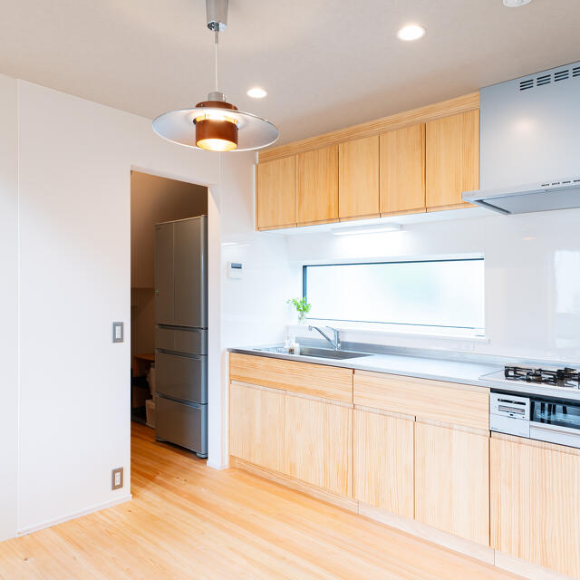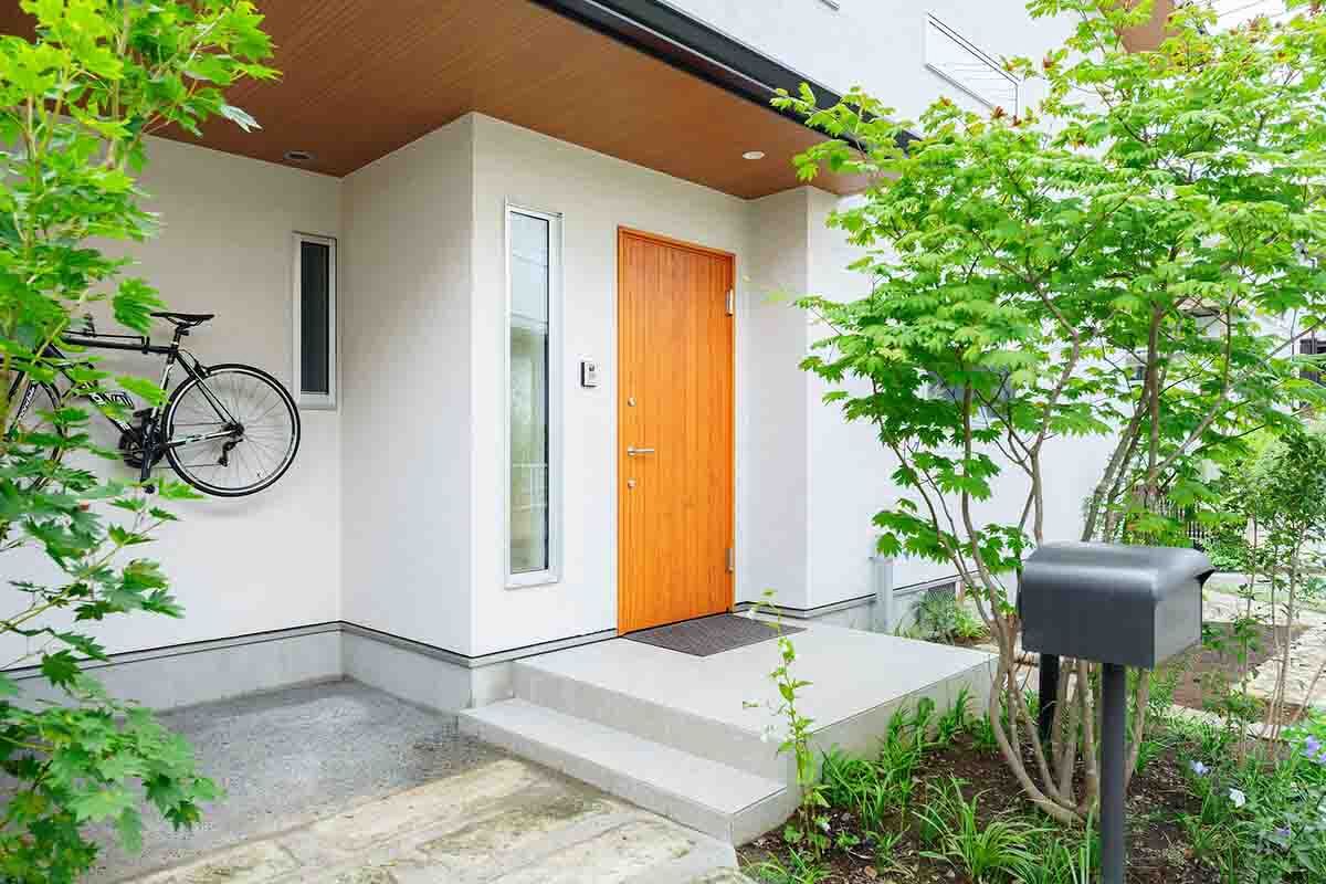 木をたっぷり使うとともに、ご夫婦が希望したのは、シンプルで無駄を省いた家にすること。インテリアは色数を最小限に、余計な家具やインテリアを置かず、エアコンなど生活感のある家電も隠すなど、ミニマルスタイルを徹底。間取りにもその考えが反映されており、吹き抜けのある大空間LDKに、毎日に必要なモノのほとんどを揃えた収納スペース、そしてゆったりとくつろげる洗面脱衣室・浴室で構成された1階は、食事をはじめ、家族団らんやお子さんの勉強、朝・夜の身支度まで、生活のほぼすべてを完結できます。「以前はマンションに住んでいて、何をするにも数歩でできるワンフロアの効率の良さを、建築士さんにそのまま持ち込んでもらいました。」その分、一戸建てならではの“庭”のある暮らしを満喫できるように、リビングには濡れ縁、洗面脱衣室には勝手口、さらに玄関からぐるりと回遊できる動線を設けるなどで、気軽に自然と触れ合えるように工夫されています。