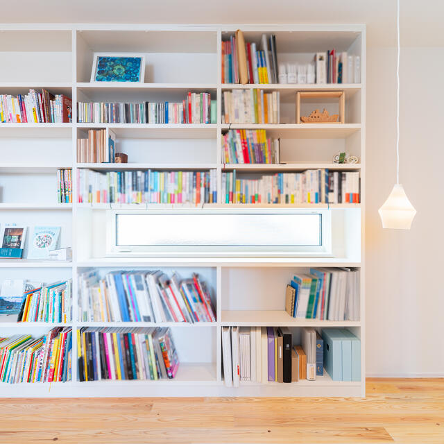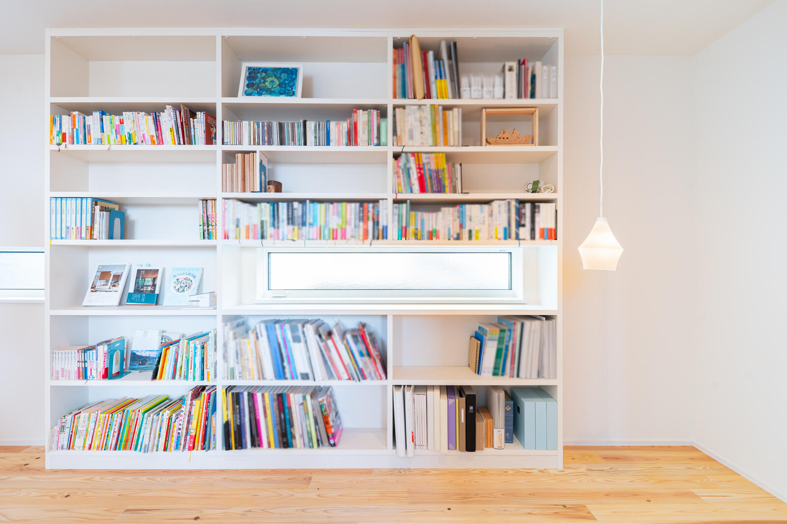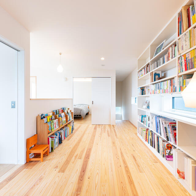 対して2階には、家で過ごす時間を大切にするファミリーライブラリーを設計。文庫や雑誌、奥様が集めたお気に入りの絵本を、コーヒー片手に窓辺でゆったりと読み耽る…そんな贅沢さを味わえる空間も叶えました。