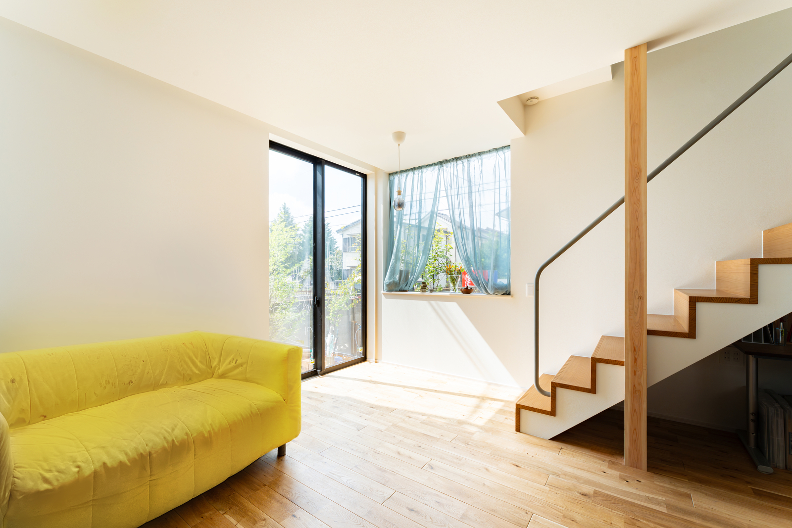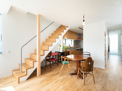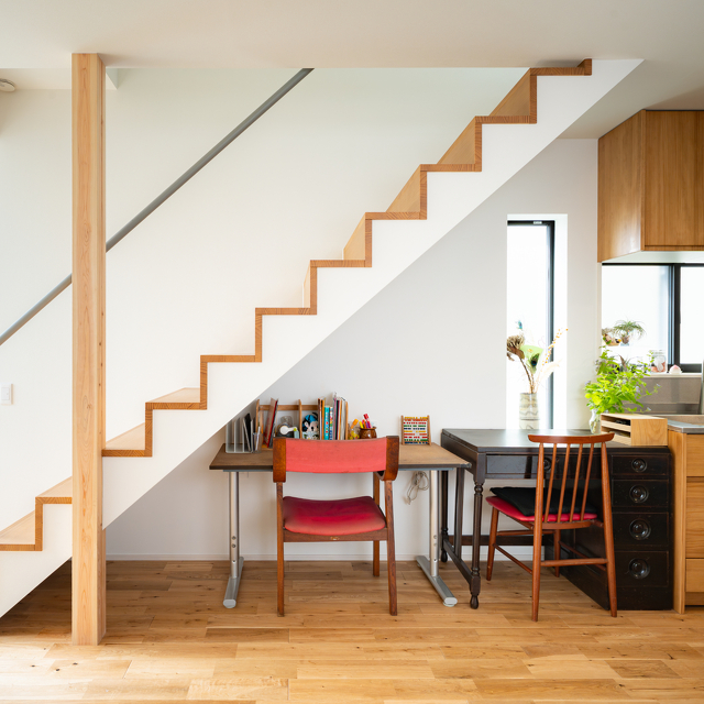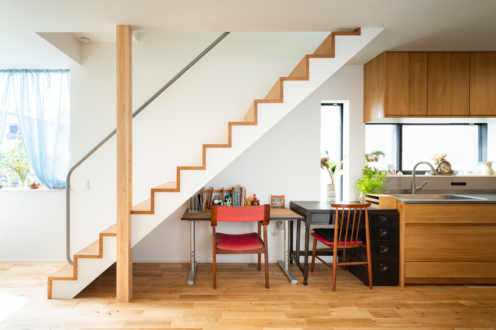 さらに、「作為的すぎず、自分たちが”自然”と感じる見た目にしたくて」と、ノイズレスな水平・垂直のラインや、空間全体に馴染む素材感などにも配慮されたご夫婦ですが、特にその想いを強く読み取れるのが、LDKでひときわ目を惹く、すらりと美しいフォルムの階段です。「室内はできる限り広く開放的にしたかったので、視線が抜けるようなリビング階段にしました。架け方や段数、側面から見える木の模様など、たくさんの事例を参考にしました。手摺りは私たちのイメージに合うものがなかなか見つからなかったのですが、最終的に建築士さんが薦めてくださったものに決めました」と、こちらも試行錯誤を重ねてカタチに。