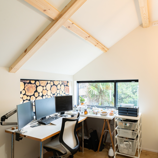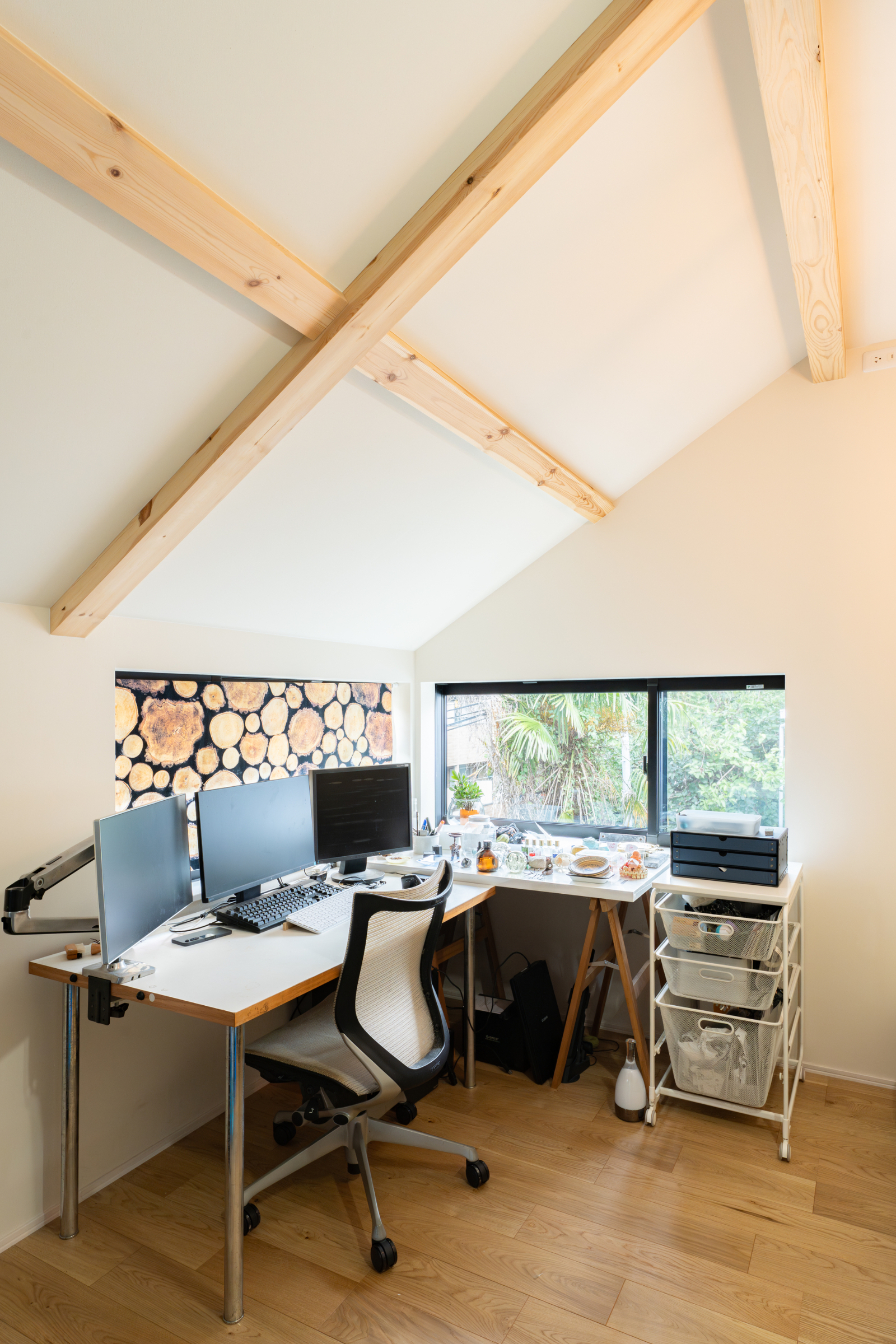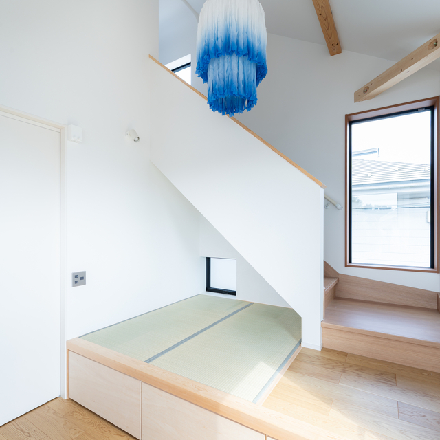 ほかにも、回遊動線の採用で人が渋滞することなくスムーズに動け、ソーラーサーキット工法とリフレア(除湿換気)の効果で、湿気もなくさらりと過ごせるなど、暮らしやすさもアップグレード。「最上階の小屋裏も、熱がこもりづらいですね。それにリフレアは小屋裏に換気システム用のスペースが不要になるので、収納や子どもたちの秘密基地にしたりと、より広く使うことができます」と、笑顔のTさん。在宅ワークがしやすい個室や、お子さんたちと一緒にものづくりも楽しめる奥様の作業室、ゲストも泊まることができる小上がりのタタミコーナーなど、仕事や趣味などを満喫できる場も随所に作り、ご家族みなさんと、またおひとりでも思うまま自由に創造力の羽を広げ感性を育める、Tさんご夫婦らしいとっておきのお住まいとなりました。